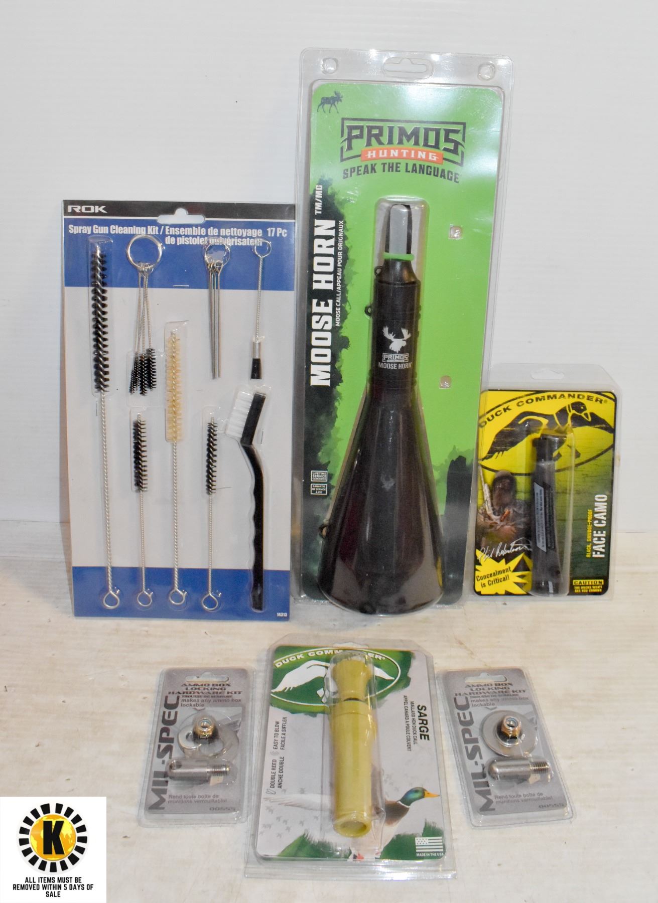 MALLARD HEN DUCK CALL SERGE & FACE CAMO W/ROK SPRAY GUN CLEANING KIT 17 PC, W/2 AMNO BOX LOCKING HARDWARE KIT & PRIMOS HUNTING MOOSE HORN