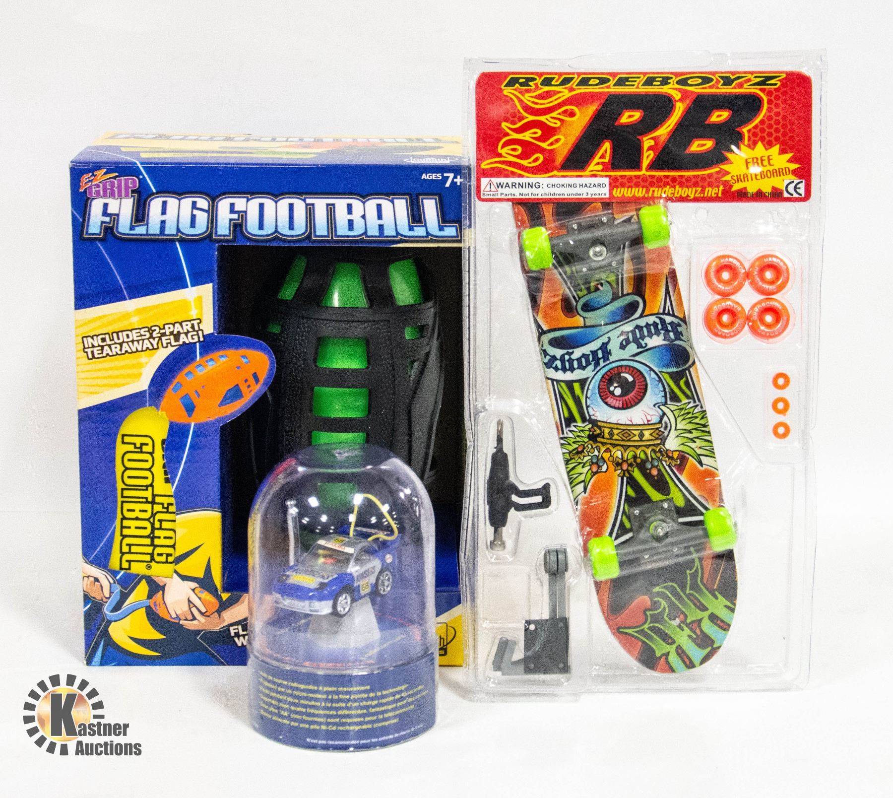 FLAG FOOTBALL, RUDE BOYZ SKATE BOARD KIT & PASCO CONTROL EXTREME MICRO RACER     **ALL ITEMS MUST BE REMOVED BY 5PM SATURDAY, JULY 8ST 2023. ALL REMAINING ITEMS WILL BE SUBJECT TO A $6.00 PER DAY STORAGE CHARGE. ANY ITEMS REMAINING AFTER MONDAY, JULY 24TH, 2023 WILL BE CONSIDERED FORFEITED. NO REFUNDS WILL BE ISSUED FOR FORFEITED ITEMS. TO SCHEDULE A PICK UP APPOINTMENT CLICK HERE