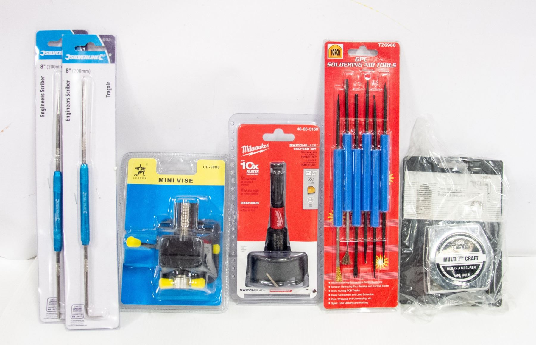 2 9/16" - 7/16" W/MULTICRAFT MEASURING TAPE, 6 PC SOLDERING AID TOOLS, (2) SILVERLINEC ENGINEERS SCRIBE SET 8" & MINI VISE
