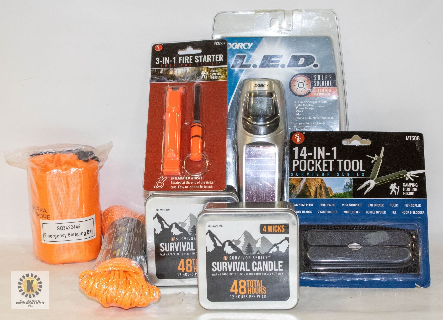 SLEEPING BAG, LED SOLAR FLASHLIGHT SET, SURVIVAL PARA CORD 500 RELECTIVE 100FT, X2 SURVIVAL CANDLE 48 HOURS EACH 4 WIICK TIN, 14-1 POCKET TOOL 3 IN 1 FIRE STARTER **ALL ITEMS MUST BE REMOVED BY 5PM SATURDAY, APRIL 26TH 2025. ALL REMAINING ITEMS WILL BE SUBJECT TO A $6.00 PER DAY STORAGE CHARGE. ANY ITEMS REMAINING AFTER MONDAY, MAY 12TH 2025 WILL BE CONSIDERED FORFEITED. NO REFUNDS WILL BE ISSUED FOR FORFEITED ITEMS. TO SCHEDULE A PICK UP APPOINTMENT CLICK HERE