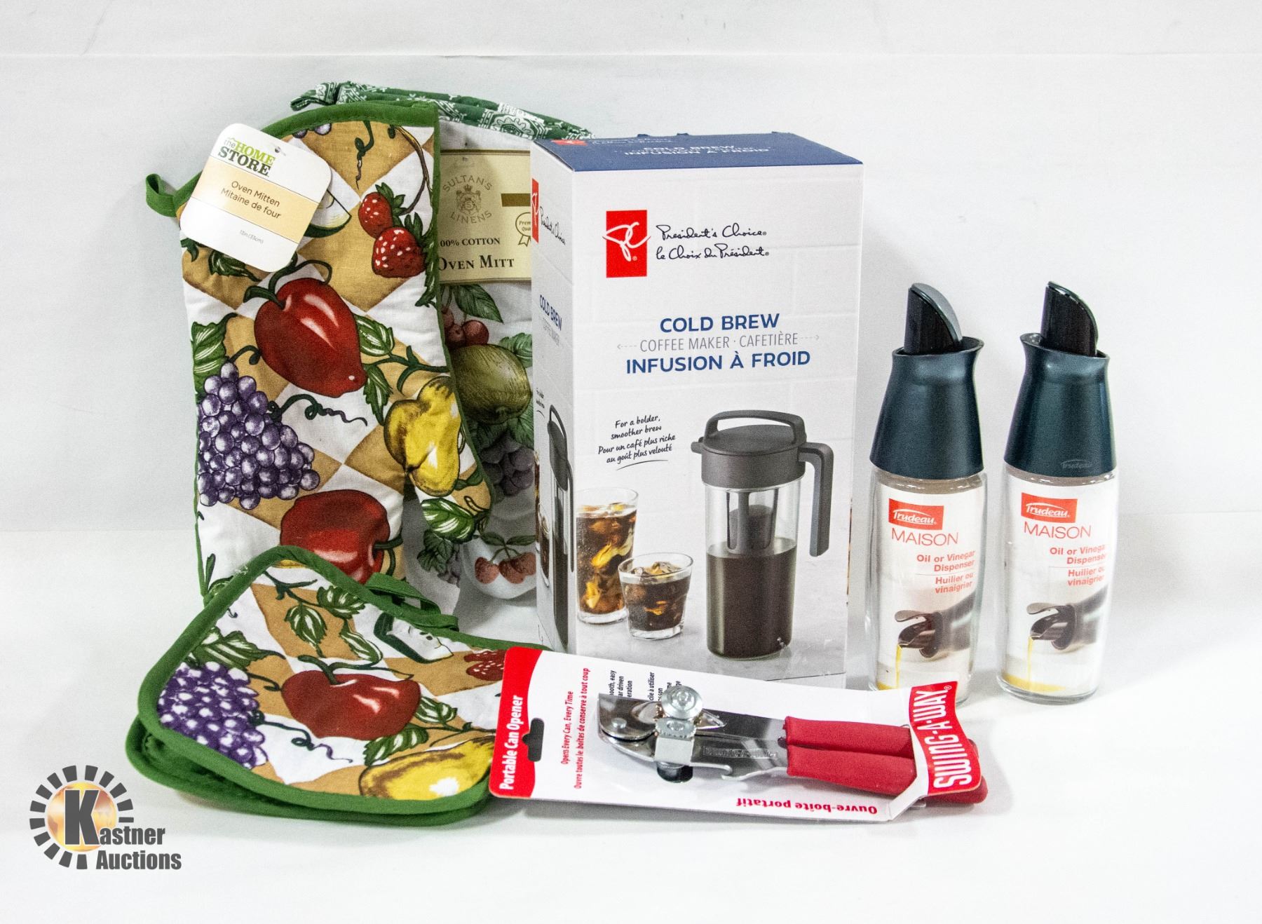 BREW COFFEE MAKER INFUSION, 2 TREDEAU MASON OIL/VINEGAR DISPENSERS, SWING-AWAY CAN OPENER **ALL ITEMS MUST BE REMOVED BY 5PM SATURDAY, FEBRUARY 15TH 2025. ALL REMAINING ITEMS WILL BE SUBJECT TO A $6.00 PER DAY STORAGE CHARGE. ANY ITEMS REMAINING AFTER MONDAY, MARCH 10TH 2025 WILL BE CONSIDERED FORFEITED. NO REFUNDS WILL BE ISSUED FOR FORFEITED ITEMS. TO SCHEDULE A PICK UP APPOINTMENT CLICK HERE