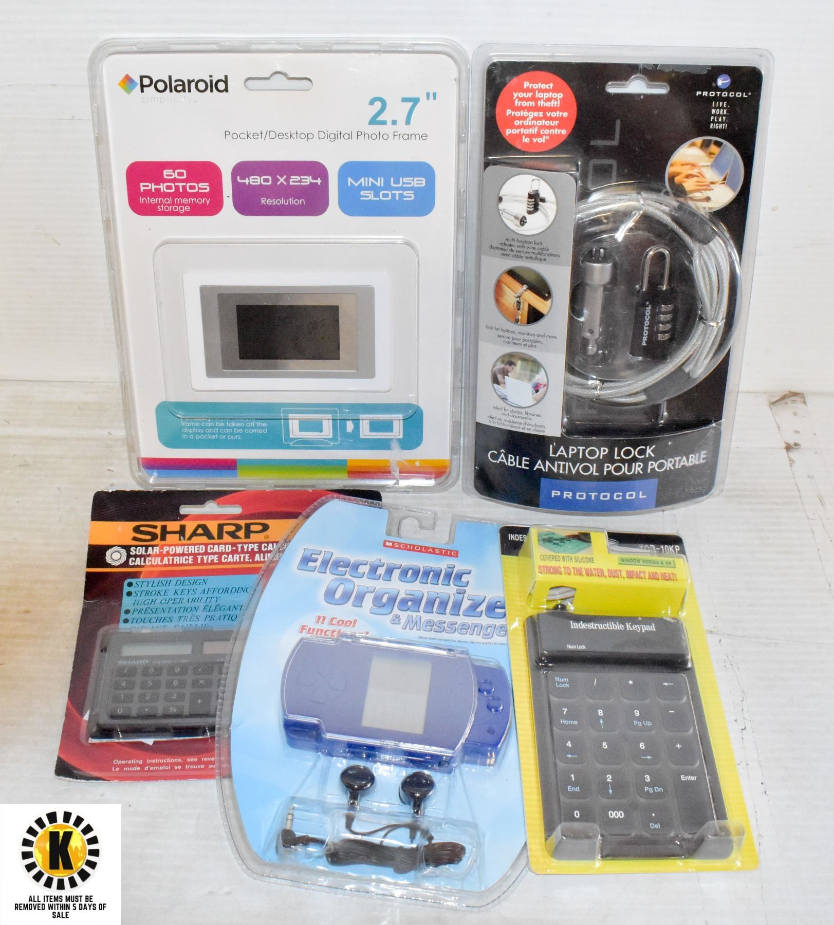 LOCK, INDESTRUCTIBLE KEY PAD, SCHOLASTIC ELECTRONIC ORGANIZER & MASSAGER 11 FUNCTIONS, POLAROID DESKTOP DIGITAL PHOTO FRAME 2.7", SHARP SOLAR CARD CALCULATOR
