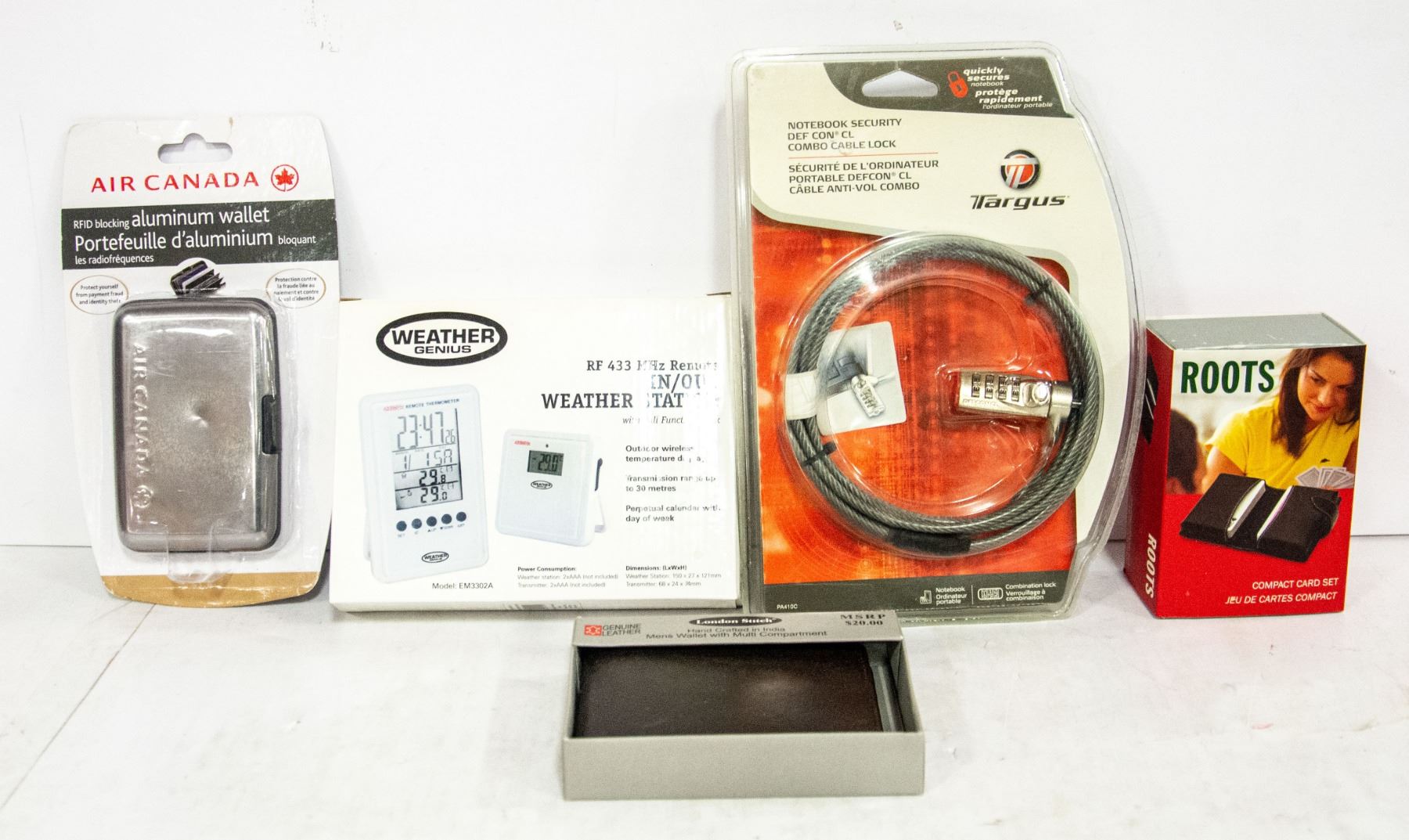 WALLET CARD HOLDER, MEN'S GENUINE LEATHER WALLET, AIR CANADA RFID BLOCKING ALUMINUM WALLET, TARGUS NOTEBOOK SECURITY COMBO CABLE LOCK, WEATHER GENIUS INDOOR/OUTDOOR WEATHER STATION FULL CLOCK