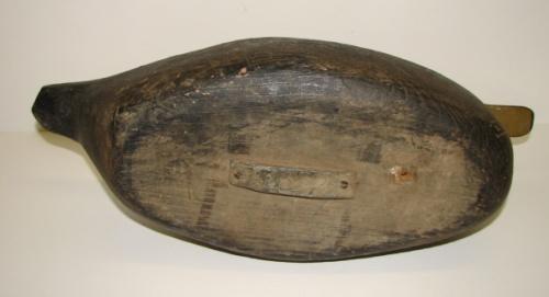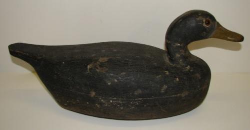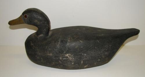 NEW JERSEY CARVED WOODEN BLACK DUCK DECOY. Has glass eyes. Has weight on bottom. Shows wear and loss to paint throughout.