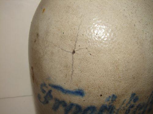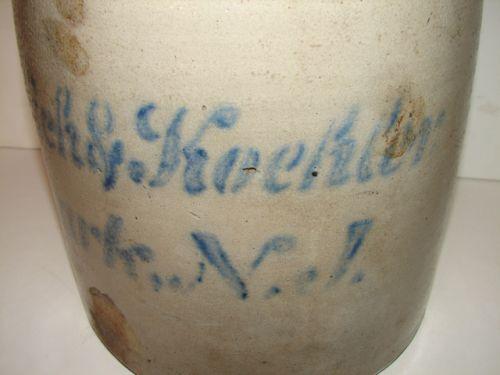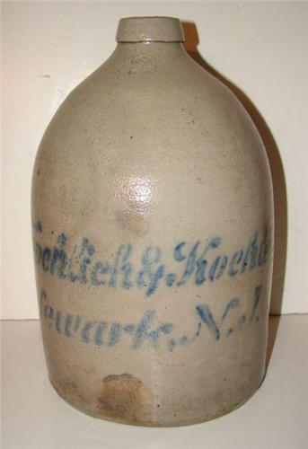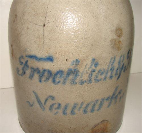 NEW JERSEY BLUE DECORATED STONEWARE JUG. 2 gallons. Cobalt blue text on body reads “Froehlich & Koehler/Newark, N.J.” Stamped “2” near spout. Shows crazing throughout. Shows one chip at body and two chips along edge of base. 13” H