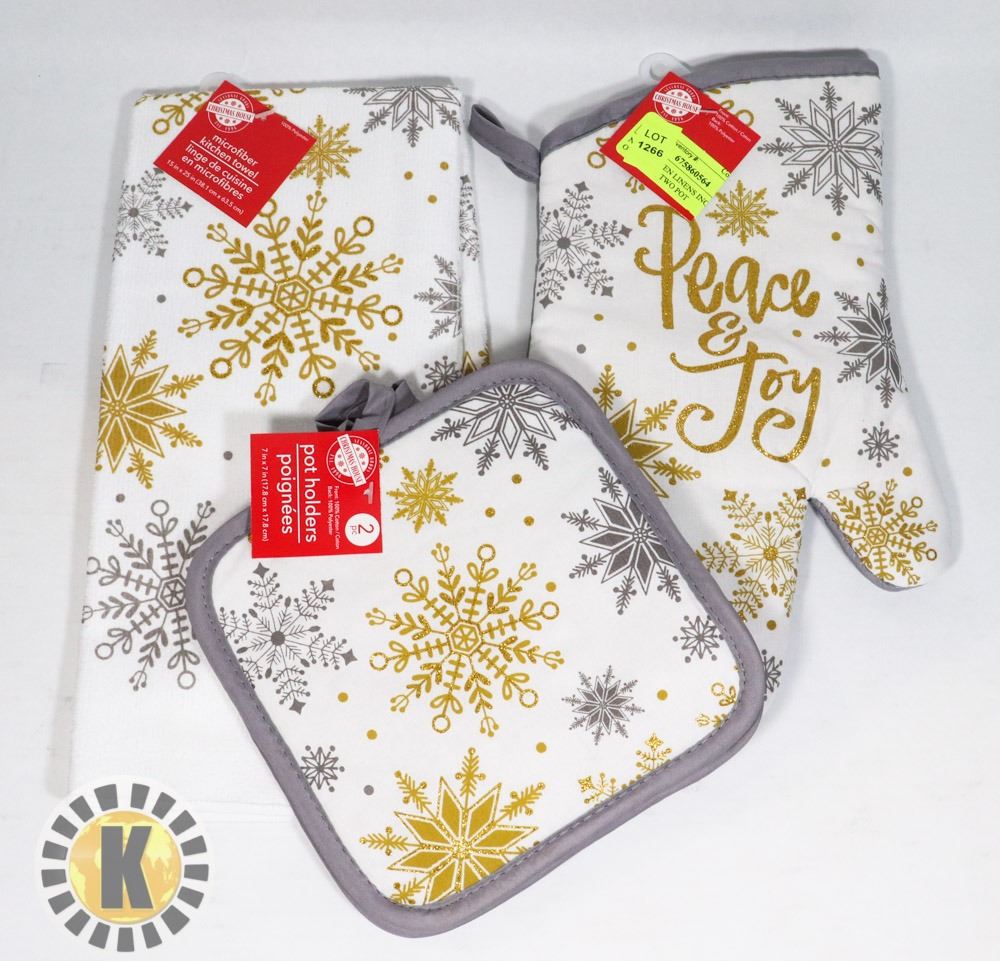 NEW KITCHEN LINENS INCLUDING OVEN MITT, TWO POT