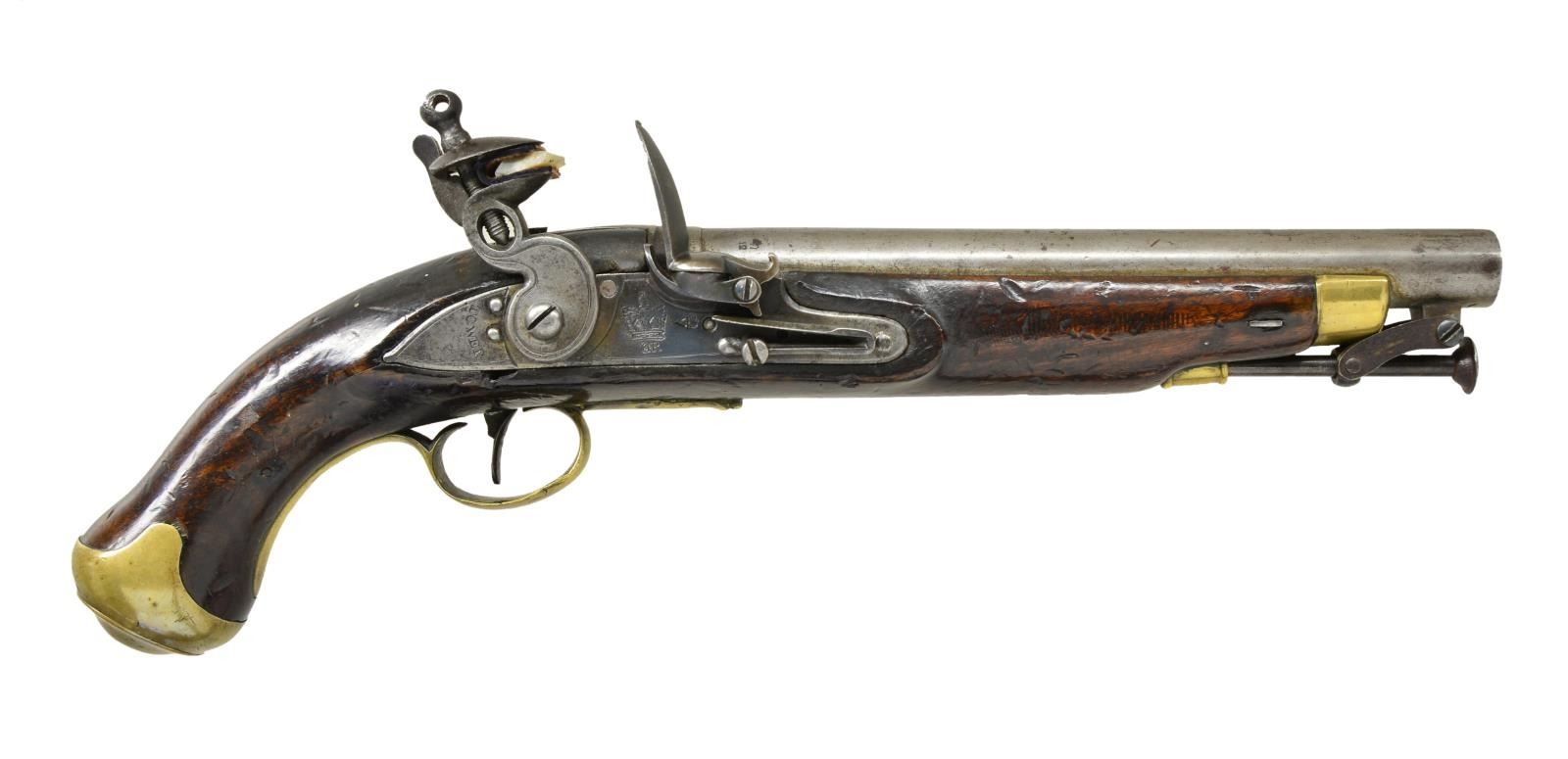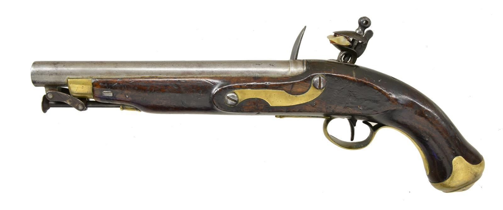 FLINTLOCK PISTOL REGIMENTALLY MARKED “Q.O.R” “Y.C” “3”. Cal. 67. NSN. This pattern 1796 pistol has 9" barrel fitted with bridled steel ramrod stamped with British black powder proofs and crowned “GR” with broad arrow. Lock marked “TOWER” on tail is stamped with crown over “GR” in front of cock and with crowned broad arrow. Lock and reinforced cock are also line border engraved. Lock features integral rounded pan with high fence, bridled friction frizzen and featherspring with ball finial. Brass mounted stock extends to within 1 1/2" of muzzle with brass cap. Trigger guard is engraved “Q.O.R” “Y.C” “3” (Queen’s Own Royal Yeomanry Cavalry, pistol number 3). All other mounts are unmarked. CONDITION: good to very good. Metal parts cleaned to pewter gray. Lock with remnants of case hardening color(?). Stock is sound with some oil rubbed in over old possibly original finish with a large number of knocks and dings. Brass once cleaned is toning to gold. Bore is fairly shiny with light pitting. Lock is good. (01-21676/MGM). ANTIQUE. $1,000-1,500.