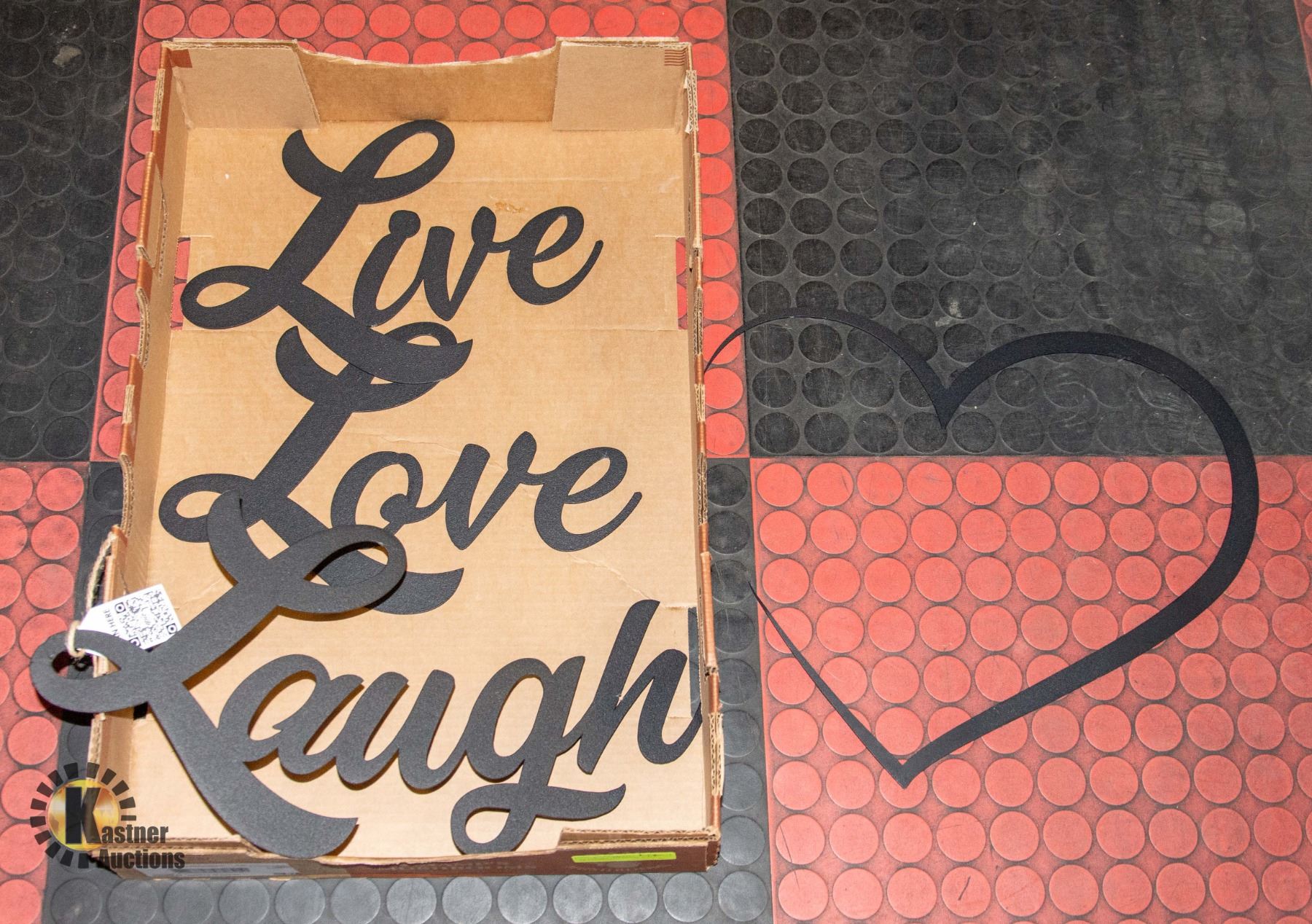 LOVE, LAUGH" WITH LARGE HEART SILLHOUETTE, BLACK METAL, EASY HANG - NEW DISPLAY SAMPLE (10"H X 40"L) **ALL ITEMS MUST BE REMOVED BY 5PM SATURDAY, OCTOBER 12TH 2024. ALL REMAINING ITEMS WILL BE SUBJECT TO A $6.00 PER DAY STORAGE CHARGE. ANY ITEMS REMAINING AFTER MONDAY, OCTOBER 27TH 2024 WILL BE CONSIDERED FORFEITED. NO REFUNDS WILL BE ISSUED FOR FORFEITED ITEMS. TO SCHEDULE A PICK UP APPOINTMENT CLICK HERE