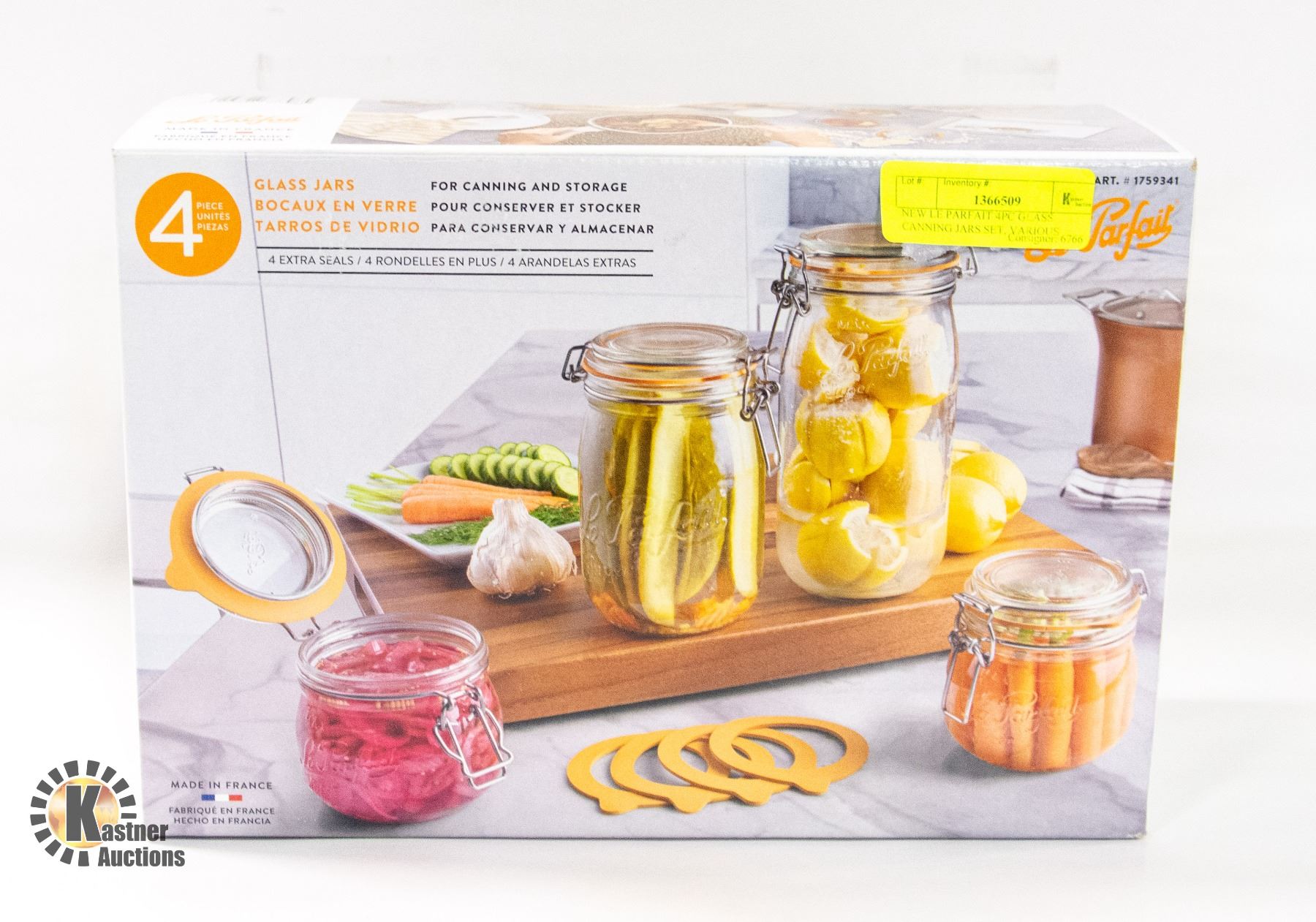 NEW LE PARFAIT 4PC GLASS CANNING JARS SET, VARIOUS