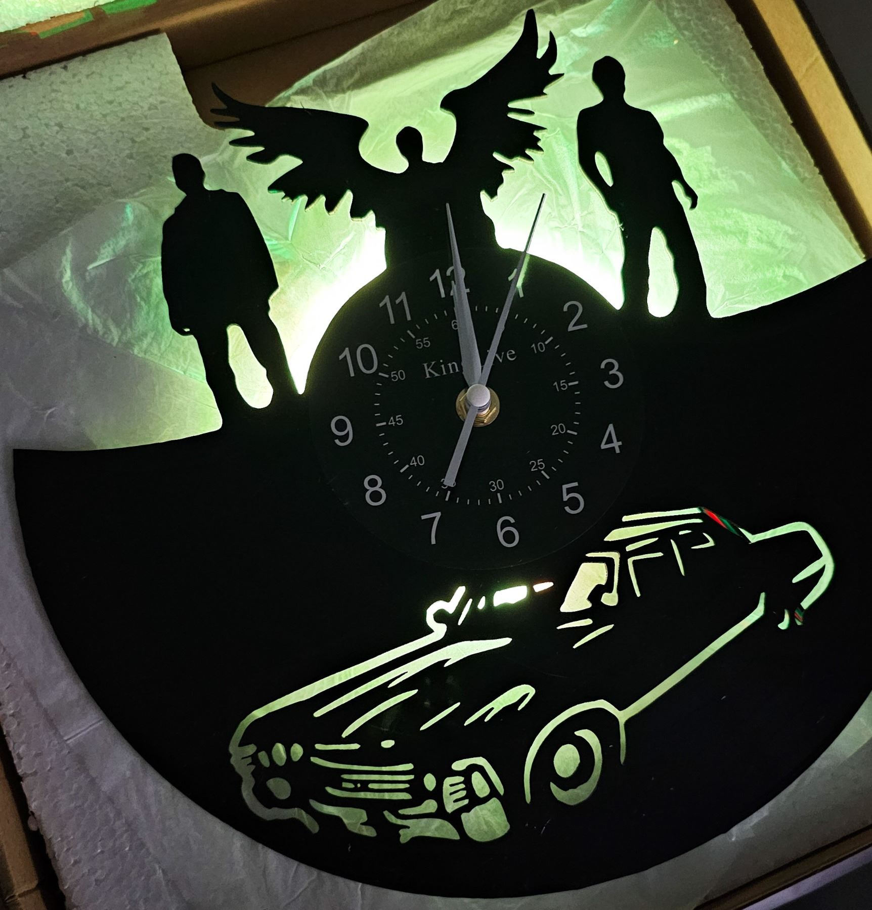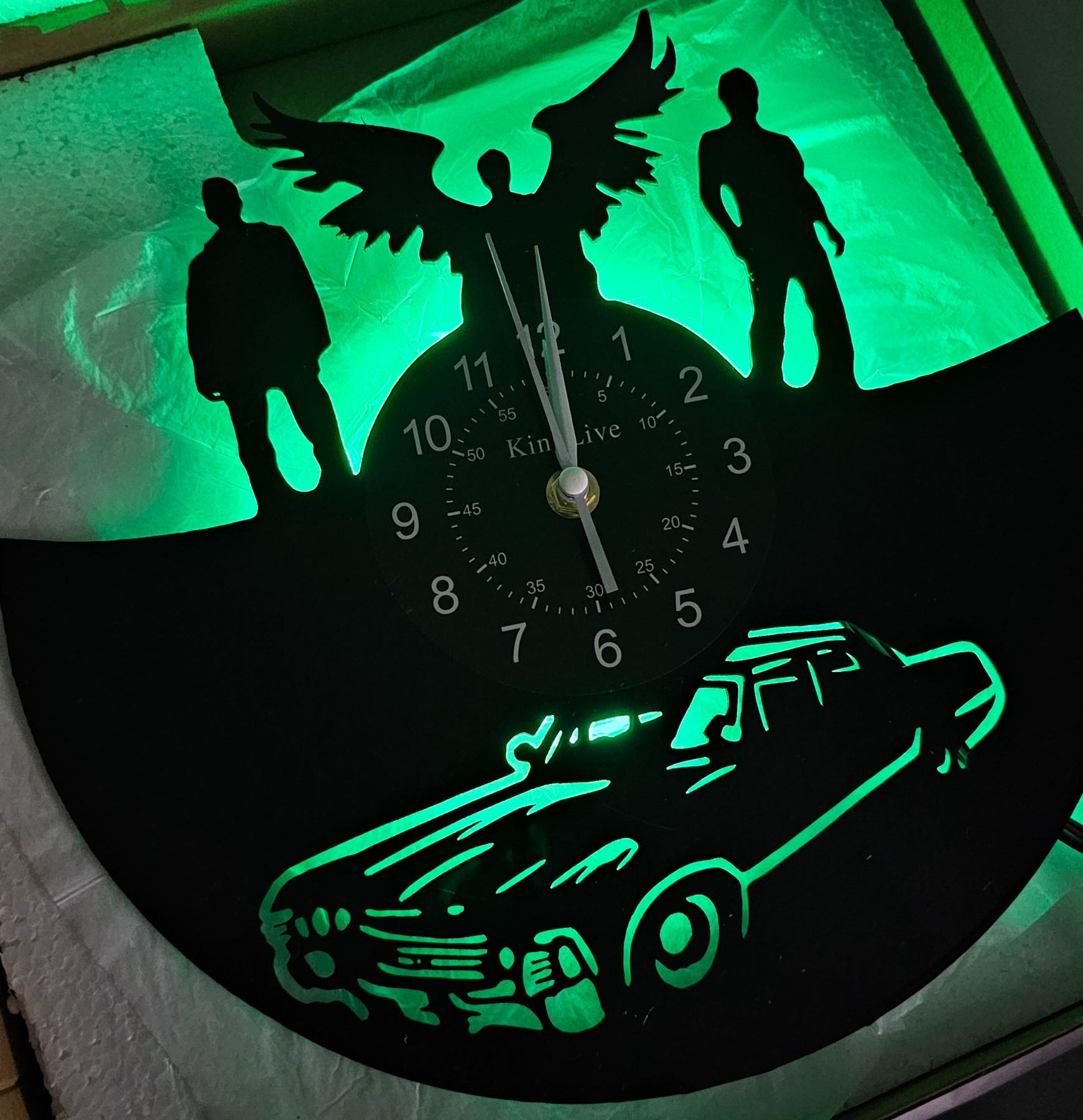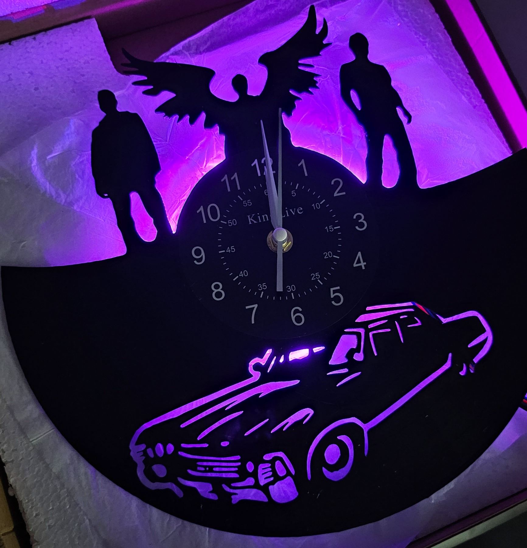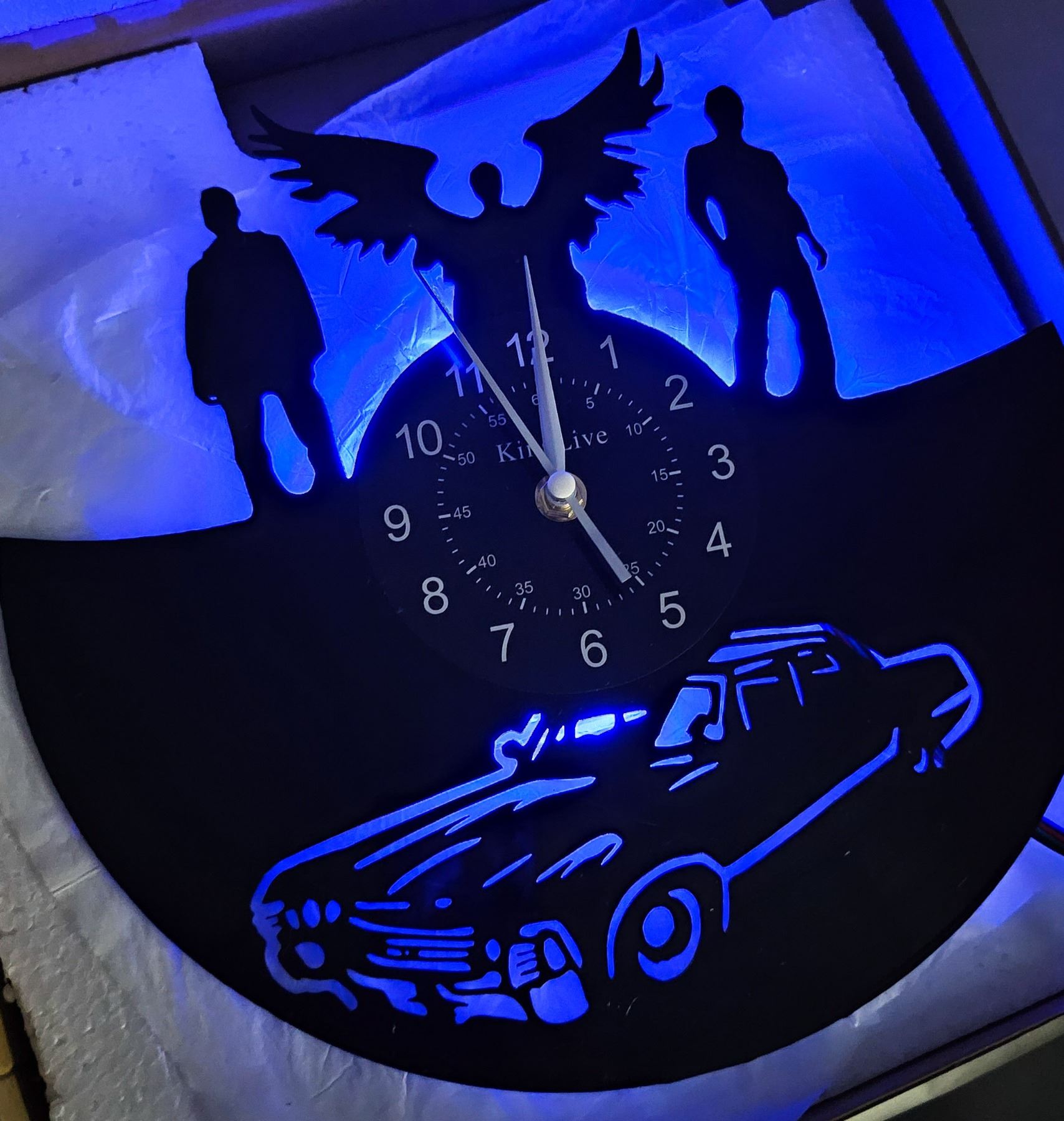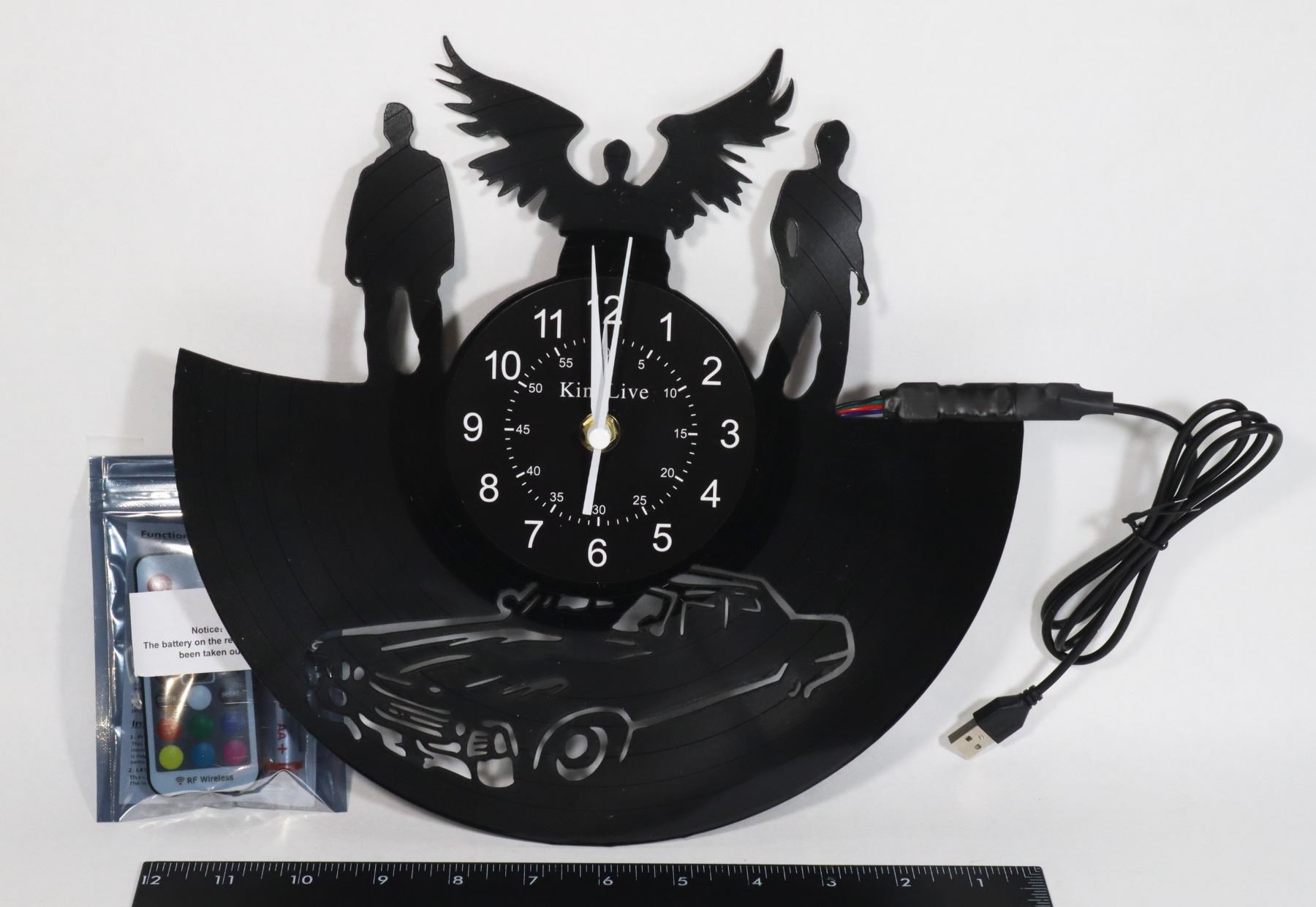 THEME WALL CLOCK. LED LIGHT CHANGES COLOR, HAS USB PLUG (BRICK NOT INCLUDED) HAS REMOTE (WITH FUNCTION KEY INSTRUCTIONS) REQUIRES 1 CR2025 BATTERY (INCLUDED). CLOCK FACE REQUIRES 1 AA BATTERY (INCLUDED)