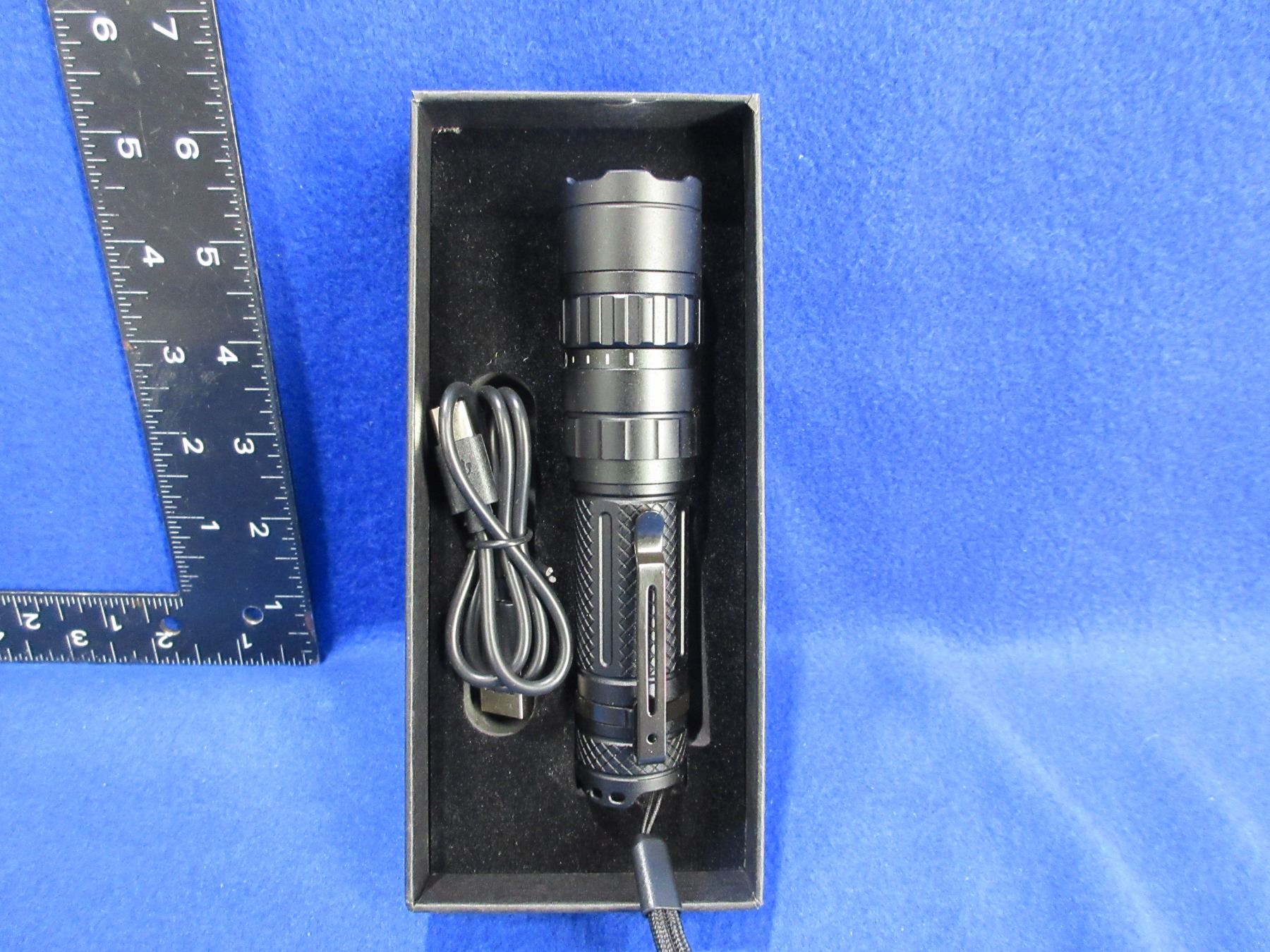 NEW - LED Flashlight with 4 Brightness and a Flash Setting - Comes in original box with a USB C charging cord and rechargeable battery