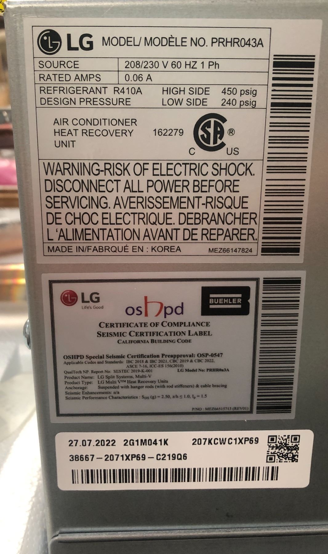 NEW LG - Heat Recovery Unit - Model: PRHR043A