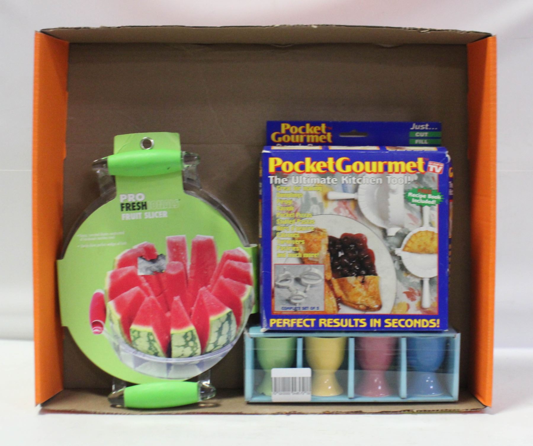 NEW LOT -EGG CUPS,+PRO FRUIT SLICER,+POCKET