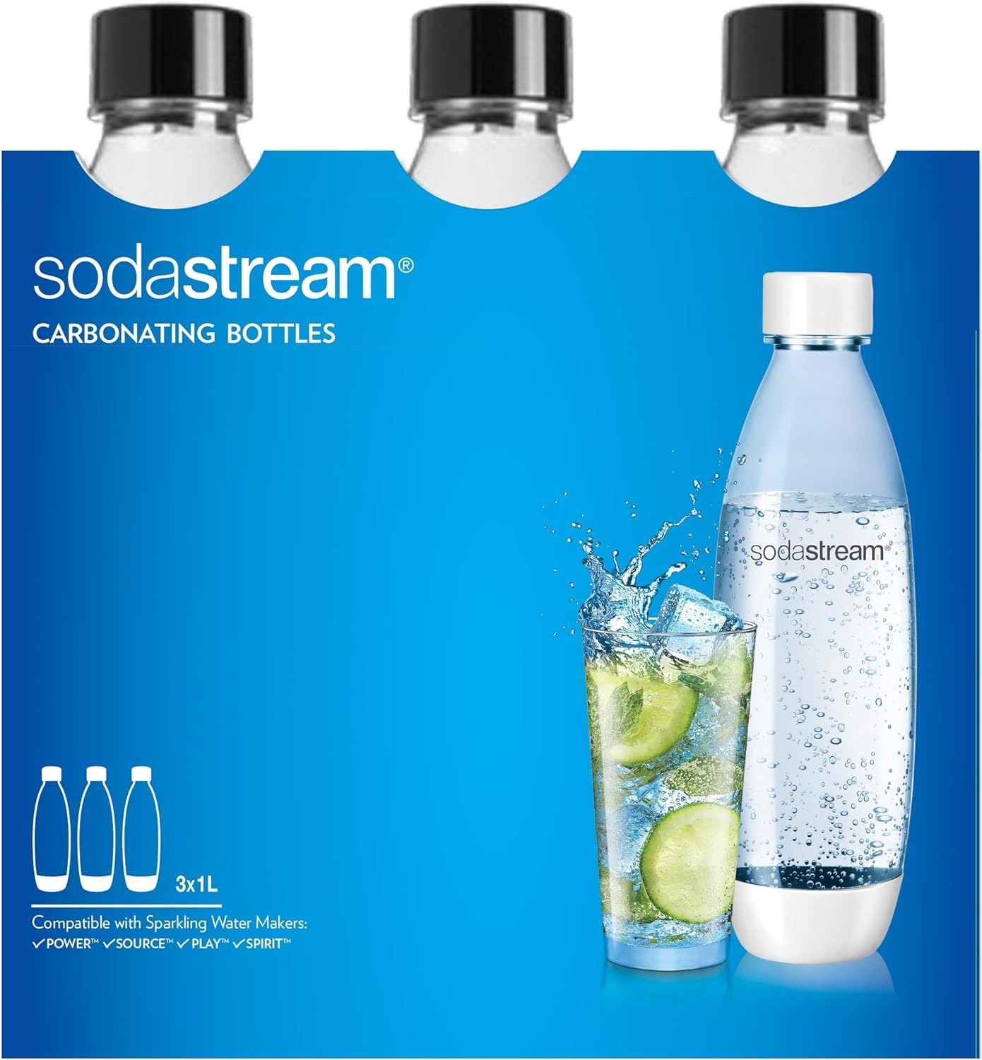 1 PACK OF 3 BLACK CARBONATING BOTTLES,WITH 1 LID MISSING, 1 PACK OF 3 GREY CARBONATING BOTTLES WITH 1 LID MISSING. COMPATIBLE WITH SPARKLING WATER MAKERS: POWER, SOURCE, PLAY , SPIRIT, FIZZI, JET, DYNAMO, GENESIS, COOL. PICTURE INDICATES BLACK PACK - AMZ SES