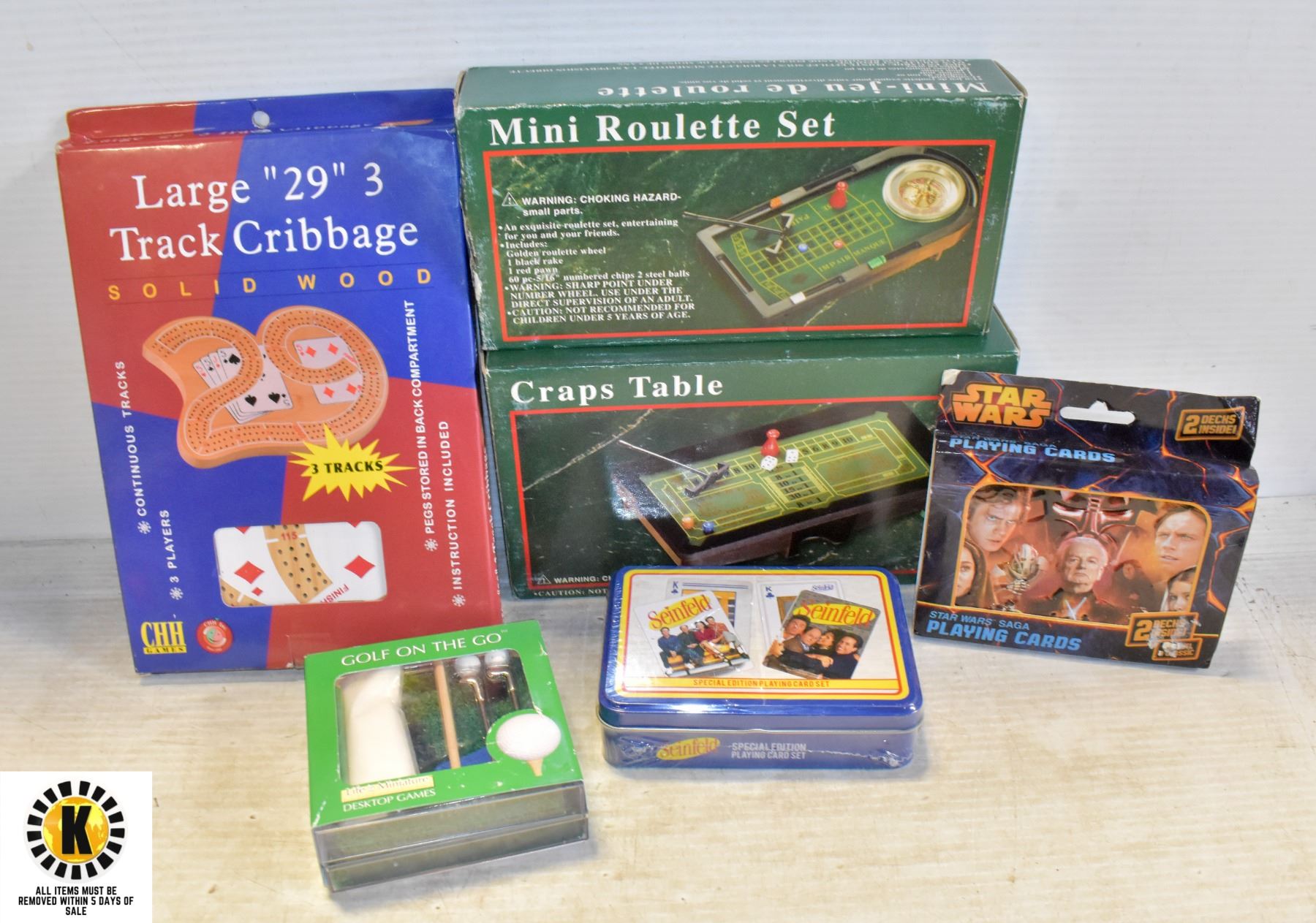 SEINFELD PLAYING CARDS, MINI ROULETTE SET, CRAPS TABLE TRACK CRIBBAGE SOLID WOOD, TOYSMITH GOLF ON THE GO MINATURE CHROME CLUBS