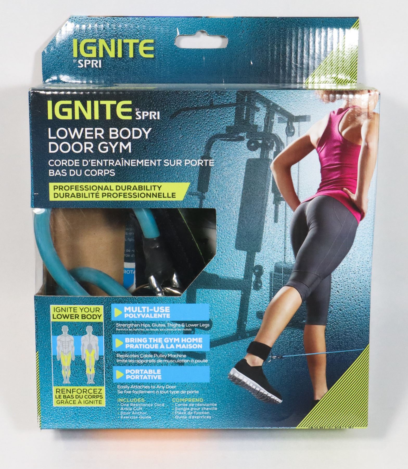INCLUDES RESISTANCE CORD, ANCLE CUFF, DOOR ANCHOR, EXERCISE GUIDE