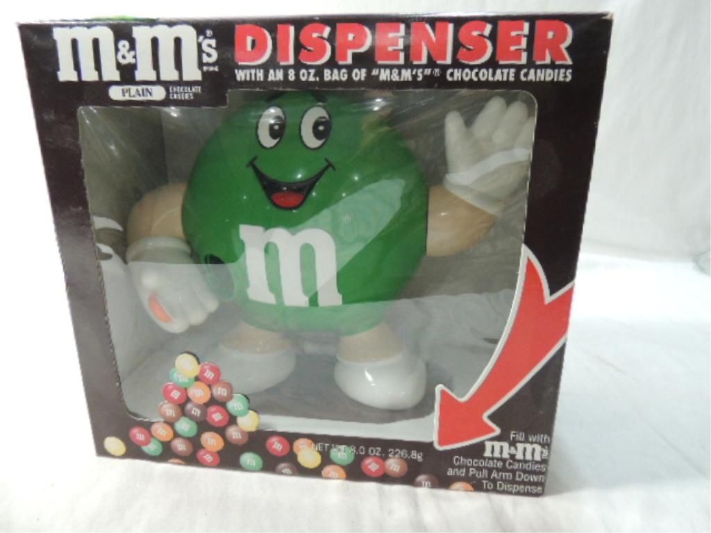 FILL WITH M&MS CHOCOLATE CANDIES AND PULL ARM DOWN TO DISPENSE. GREEN M&M AS SHOWN. SEE PHOTO FOR MORE DETAILS.