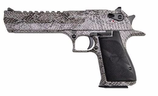 FAMILY:Desert Eagle Series MODEL:Desert Eagle TYPE:Semi-Auto Pistol ACTION:Double / Single Action FINISH:Dark Snakeskin Pattern STOCK/FRAME:Steel Frame STOCK/GRIPS:Black Synthetic CALIBER/GAUGE:50 AE CAPACITY:7+1 BARREL:6" OVERALL LENGTH:10.75" RATE-OF-TWIST:1:19 SIGHTS:Fixed ADDL INFO:Top Accessory Rail