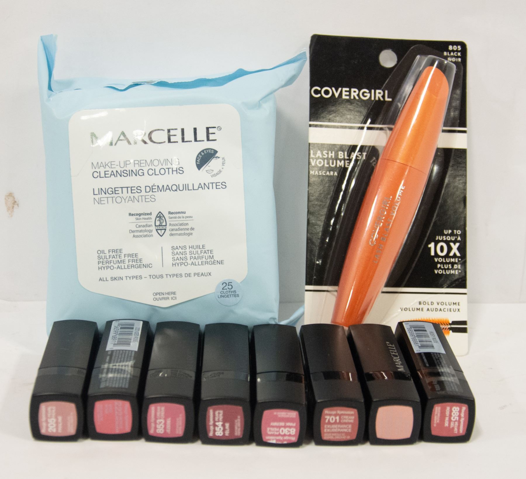 8 NEW ROUGE XPRESSION LIPSTICKS (COLOR 205, 222, 275, 701, 830, 853, 854, 885) AND 1 COVERGIRL LASH BLAST VOLUME MASCARA BLACK AND 1 BAG OF MAKE-UP REMOVING CLEANSING CLOTHS WHICH ARE HYPO ALLERGENIC AND NO OIL
