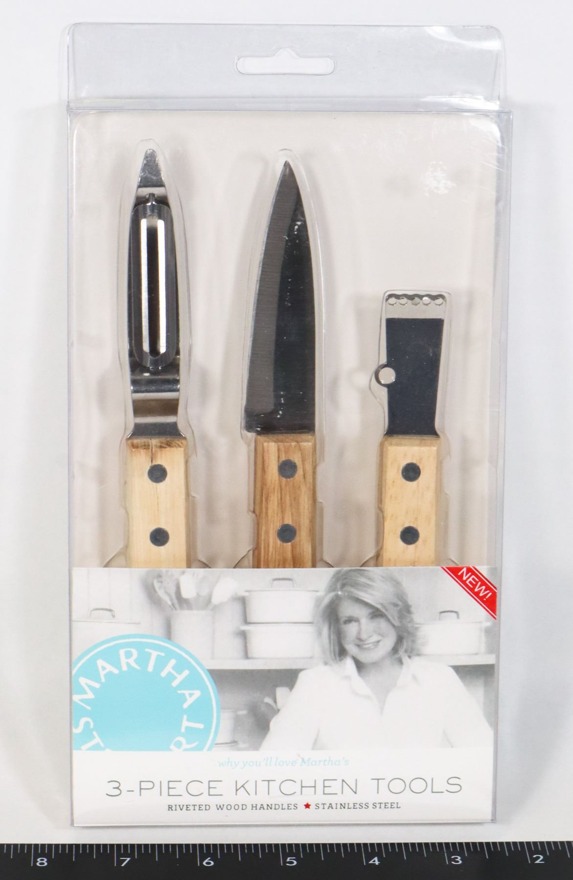 RIVETED WOOD HANDLES, STAINLESS STEEL. PEELER, PARING KNIFE, AND ZESTER.