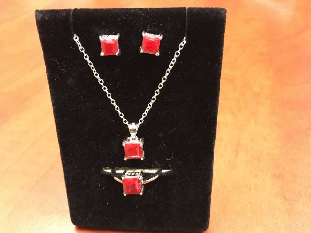 NEW MATCHING RUBY RING, NECKLACE & EARRING SET. 5.20 CT PRINCESS CUT STERLING SILVER INCLUDES $500 CERTIFICATE