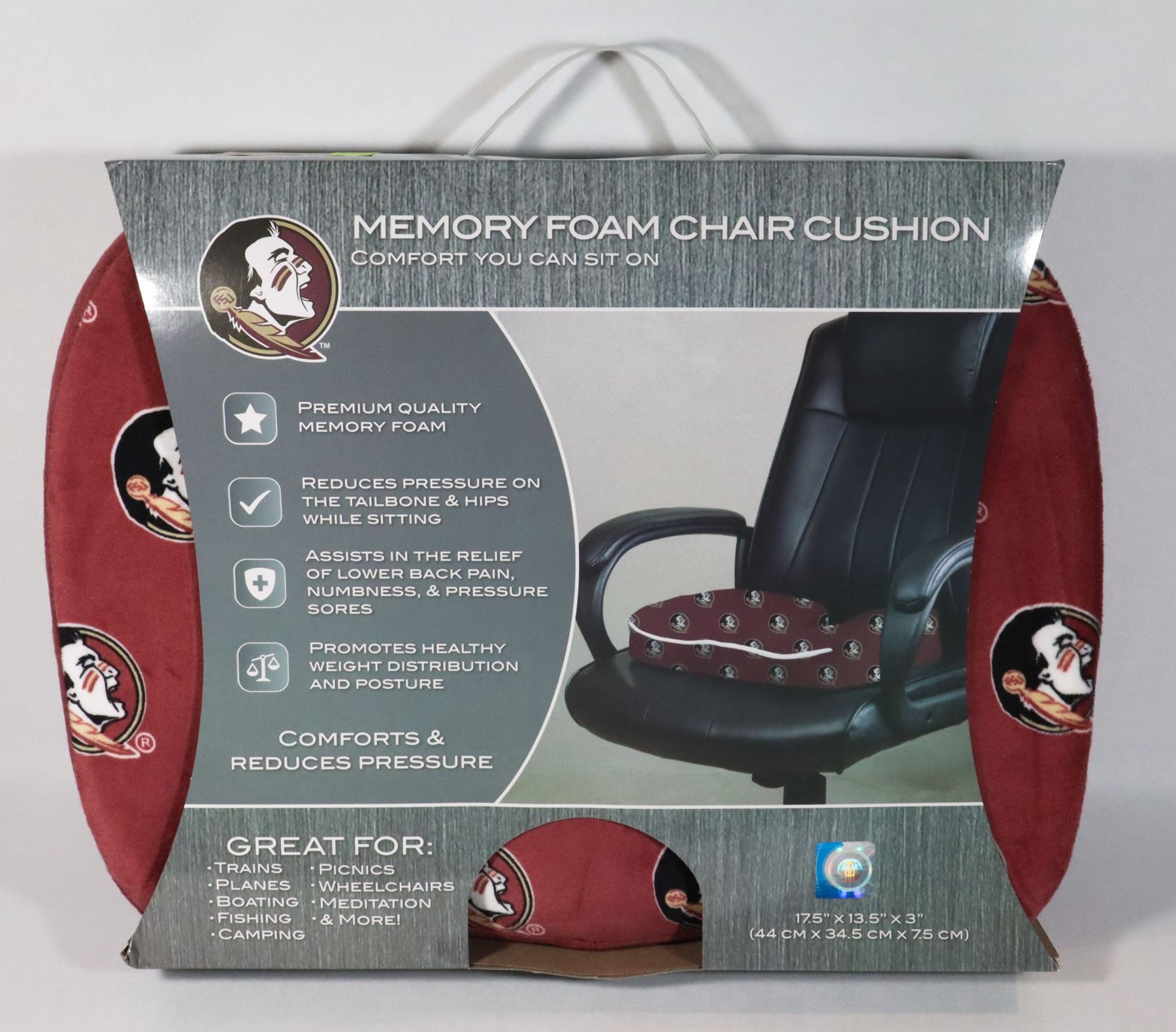 COLLEGIATE PRODUCTS. REDUCES PRESSURE ON HIPS AND TAILBONE, ASSISTS IN THE RELIEF OF LOWER BACK PAIN.