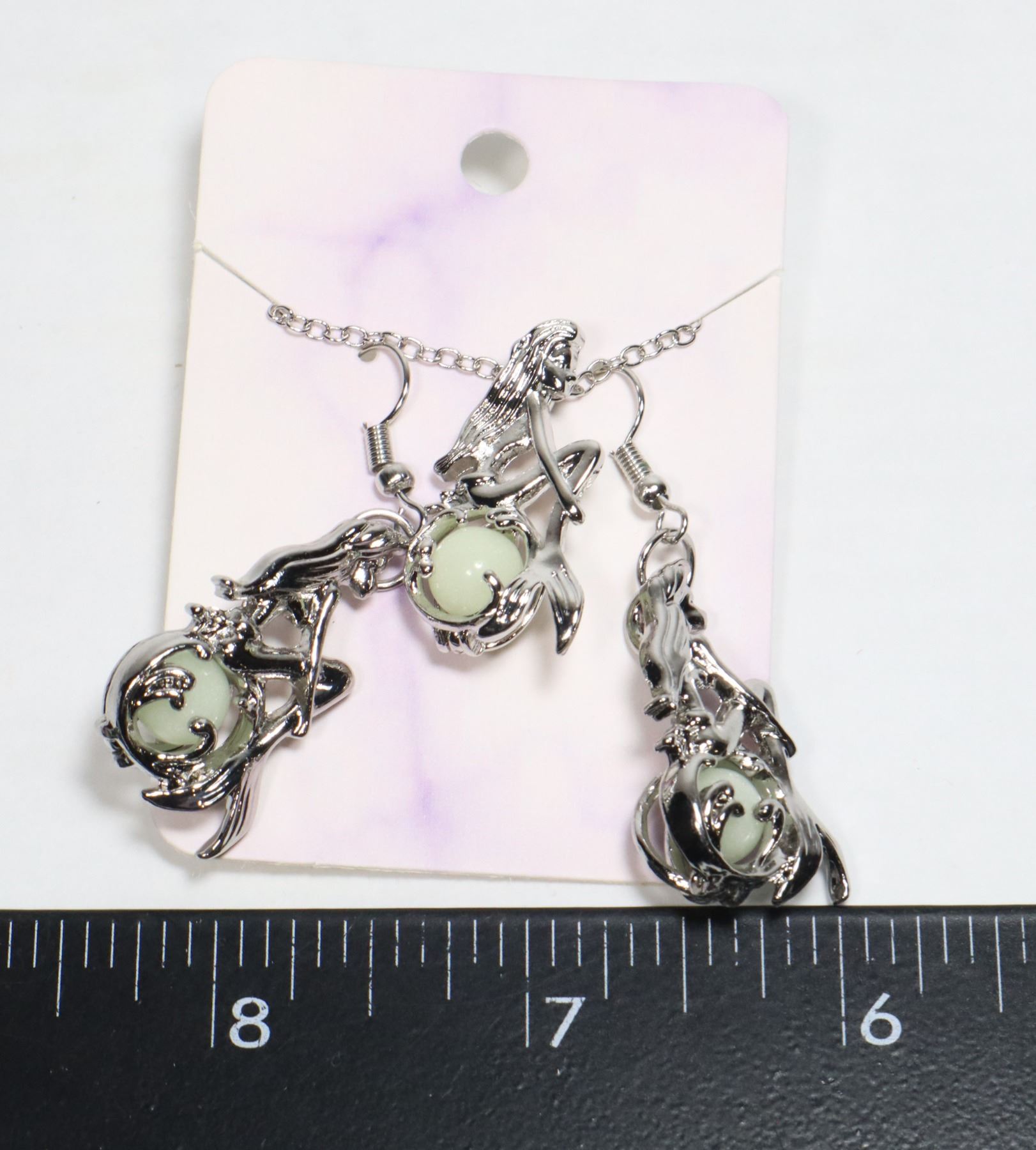 MERMAID SITS UPON GLOW IN THE DARK BEAD (GREEN HUE GLOW). FASHION JEWELRY