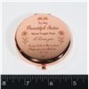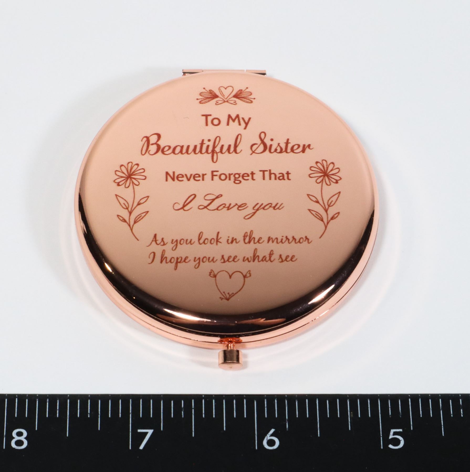 MIRROR REGULAR. 1 MIRROR MAGNIFIED. MESSAGE SAYS: TO MY BEAUTIFUL SISTER NEVER FORGET THAT I LOVE YOU AS YOU LOOK IN THE MIRROR I HOPE YOU SEE WHAT SEE.