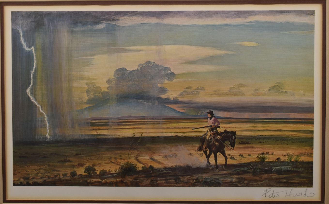 Vintage New Mexican, print on paper of cowboy riding from thunderstorm hand signed by Peter Hurd 11.5" x 18.75" matted and framed to 18.5" x 26"