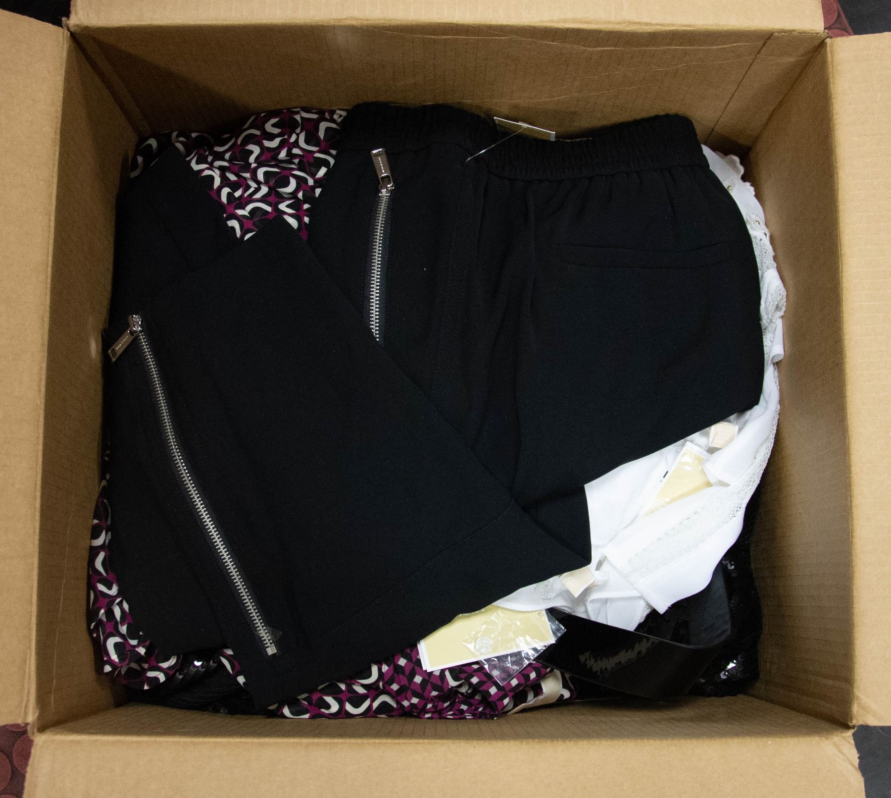 BLACK DRESS SIZE XS, S, GREY PANTS SIZE 14, 12, 2, 0, BLOUSE SIZE S, XL, SWQUIN BLACK BELTED DRESS SIZE S, M, XS, WHITE BLOUSE SIZE L, XS, BLACK PANT SIZE L. **ALL ITEMS MUST BE REMOVED BY 5PM SATURDAY, JANUARY 4TH 2025. ALL REMAINING ITEMS WILL BE SUBJECT TO A $6.00 PER DAY STORAGE CHARGE. ANY ITEMS REMAINING AFTER MONDAY, JANUARY 27TH 2025 WILL BE CONSIDERED FORFEITED. NO REFUNDS WILL BE ISSUED FOR FORFEITED ITEMS. TO SCHEDULE A PICK UP APPOINTMENT CLICK HERE