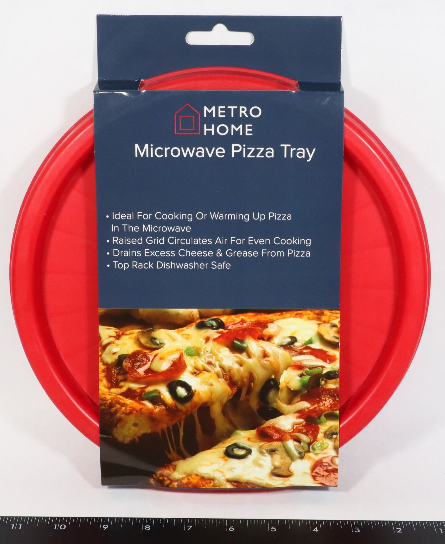 WARMING UP PIZZA IN THE MICROWAVE. RAISED GRID CIRCULATES AIR FOR EVEN COOKING. DISHWASHER TOP RACK SAFE