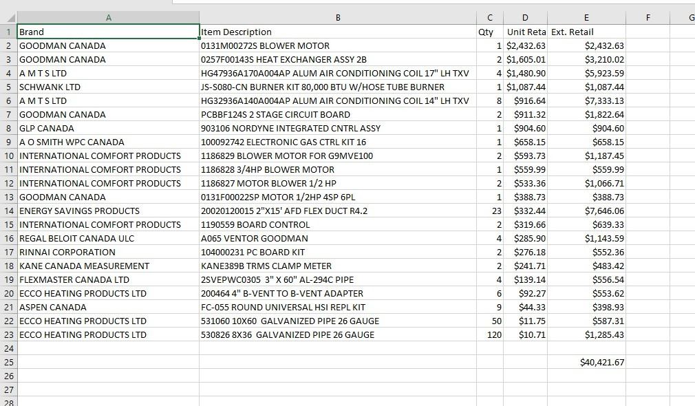 HARDWARE, 5 PALLETS, NEW CONDITION INCLUDING GOODMAN/ECCO HEATING/ASPEN/FLEXMASTER/KANE/RINNAI/REGAL BELOIT/ENERGY SAVING/A O SMITH/GLP/AMTS/SCHWANK AND MORE BRANDS, BLOWER MOTORS / HEAT EXCHANGERS / COILS / BURNER KITS / CONTROL ASSEMBLY / CIRCUIT BOARDS / PIPE / CLAMP METERS / FLEX DUCT AND MORE, OVER $40000 DOLLARS OF PRODUCT IN THIS LOT, WOL SES **ALL ITEMS MUST BE REMOVED BY 5PM SATURDAY, FEBRUARY 25TH 2023. ALL REMAINING ITEMS WILL BE SUBJECT TO A $6.00 PER DAY STORAGE CHARGE. ANY ITEMS REMAINING AFTER MONDAY, MARCH 13TH, 2023 WILL BE CONSIDERED FORFEITED. NO REFUNDS WILL BE ISSUED FOR FORFEITED ITEMS. TO SCHEDULE A PICK UP APPOINTMENT CLICK HERE