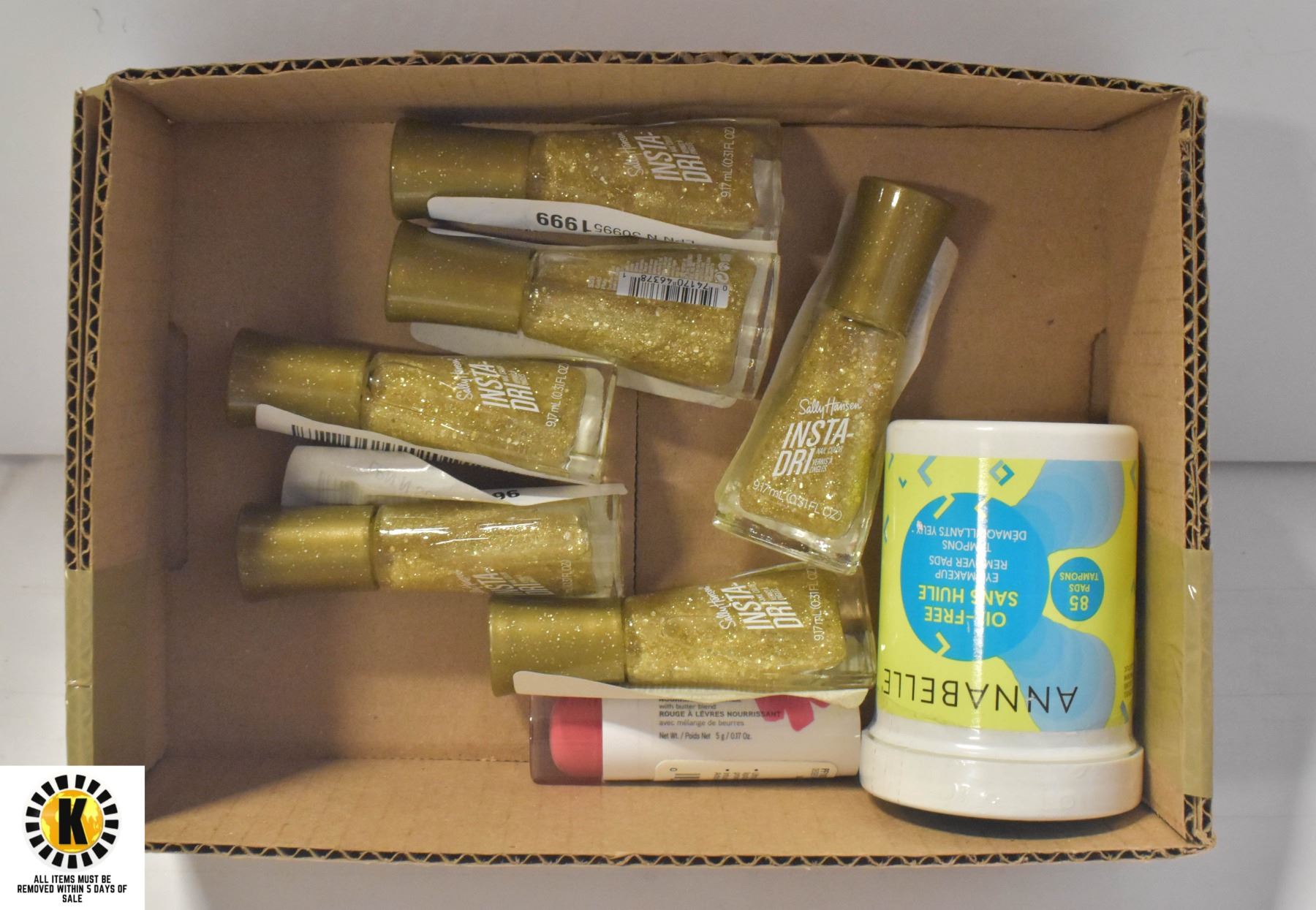 PHYSICIANS FORMULA NOURISHING LIPSTICK WITH BUTTER BLEND DESERT ROSE, 6 X SALLY HANSEN INSTA DRY GOLD PLAY NAIL POLISH, ANNABELLE OIL FREE EYE MAKEUP REMOVER PADS, AMZ SES