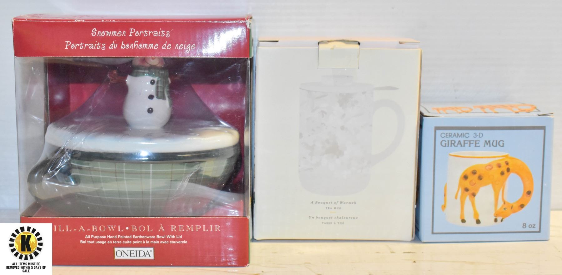 TEA MUG WITH STAINLESS STEEL INFUSER W/GIRAFFE CERAMIC MUG MDE IN BRAZIL & ONEIDA SNOWMAN FILL-A-BOWL