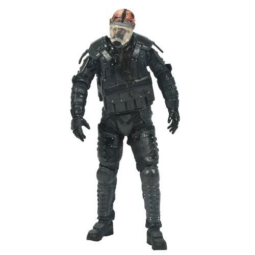 This poor soul used to represent orderly conduct and law. Now he just wants your human flesh! From the Walking Dead TV Series 4 comes this Riot Gear Gas Mask Zombie action figure with a riot gear shield, removable gas mask to expose his skinless face. Riot Gear Gas Mask Zombie stands approximately 5-inches tall and features over 20 points in articulation. Riot Gear Gas Mask Zombie comes in blister card packaging. Measures about 5-inches tall. Ages 13 and up.