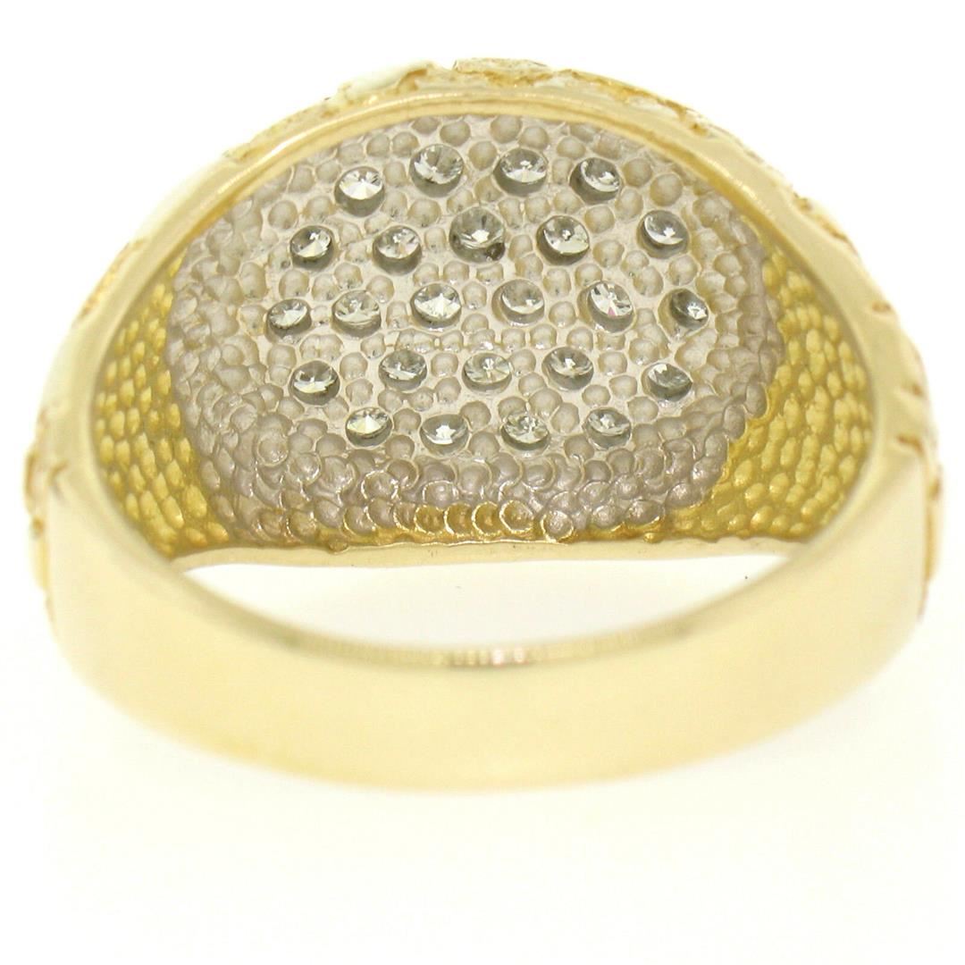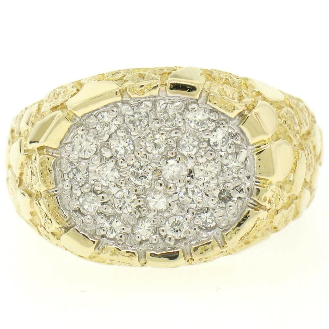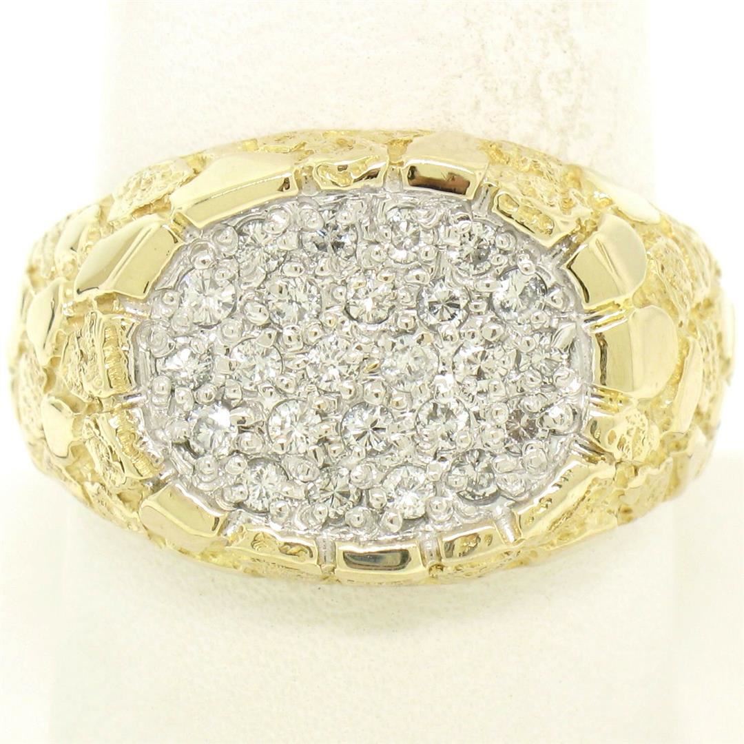 One NEW Men's 14K Two Tone Gold Nugget Texture 0.60ctw Oval Round Diamond Cluster Ring. Item Details: Material: Solid 14K Yellow and White Gold, Weight: 8.72 Grams, Stone(s): (24) Natural Genuine Diamonds - Round Brilliant Cut - Pavé Set - G/H Color - VS2/SI1 Clarity, Total Carat Weight: 0.60 (approx.), Ring Size: 9.5 , Ring Width: 14.20mm, Ring Height: 3.97mm rise off the finger, Condition: New w/o Tag!