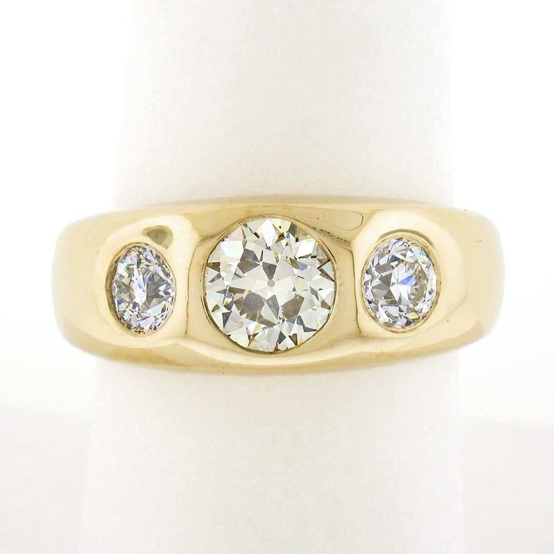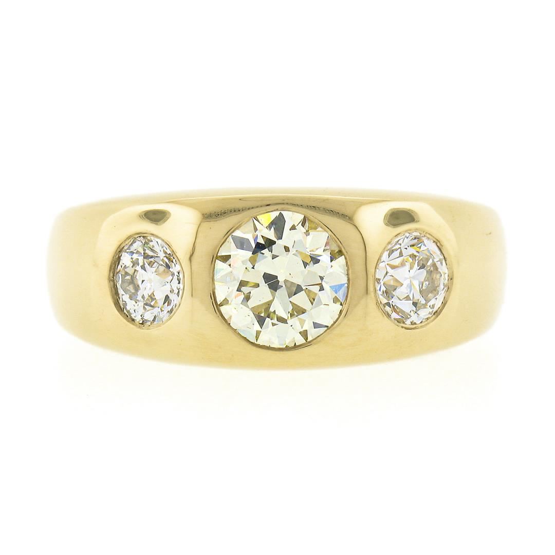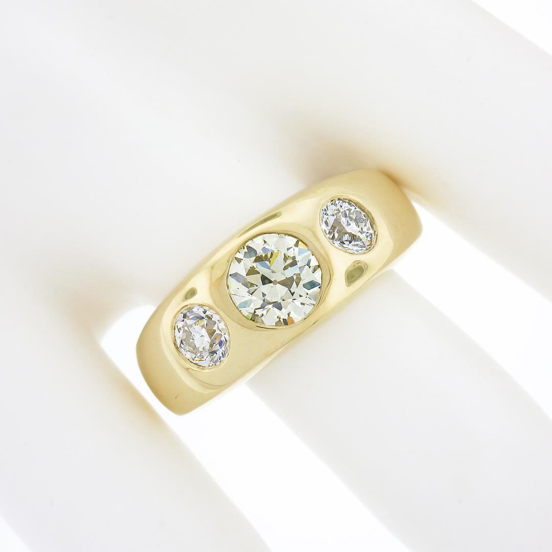 A new soliod 18k yellow gold band ring, with 1 GIA graded old european cut natural diamond (S/T - VS2 ; 1.14ct), and 2 old european cut natural diamonds (H/I - VS2/SI1 ; 0.82ctw). The ring is size 9.0, weighs a total of 10.56 grams, and measures 9.1mm wide. Comes with all original relevant certifications.