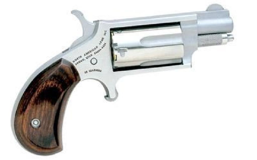 North American Arms, Mini Revolver, Single Action, 22WMR, 1.125" Barrel, Steel Frame, Stainless Finish, Wood Grips, Fixed Sights, 5Rd Product Specifications UPC Code: 744253000218 Manufacturer: North American Arms Model: Mini Revolver Action: Revolver Type: Single Action Caliber: 22WMR Barrel Length: 1.125" Frame/Material: Steel Finish/Color: Stainless Grips/Stock: Wood Capacity: 5Rd Manufacturer Wt: 5.9oz Sights: Fixed Sights Manufacturer Part #: NAA-22MS