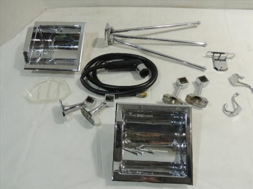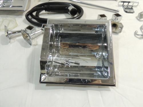 NEW NEVER USED BATHROOM CHROME TOWL RACKS, WALL SOAP DISHES AND SINK SPRAY NOZZLE. AS SHOWN. VIEW PICTURE FOR DETAIL.