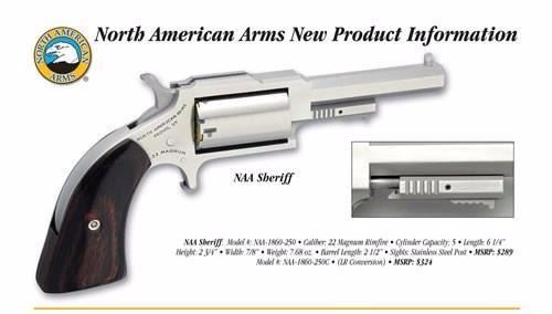 Mfr Items:NAA Category:REVOLVERS Action:Single Caliber:22 Winchester Magnum Rimfire (WMR) Barrel Length:2.5" Capacity:5 Hammer Style:Spurred Grips:Wood Sights:Bead Front Weight:7.68 oz Frame Description:Stainless Frame Size:Compact Cylinder Finish:Black Barrel Finish:Black