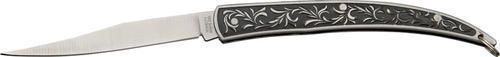 4" closed. 3 1/8" stainless long clip blade. Stainless handles with filigree design on black background. Keyring.