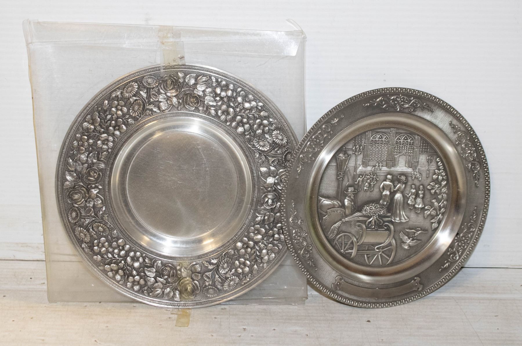 NEW OLD STOCK PEWTER WALL PLATES, SET OF 2