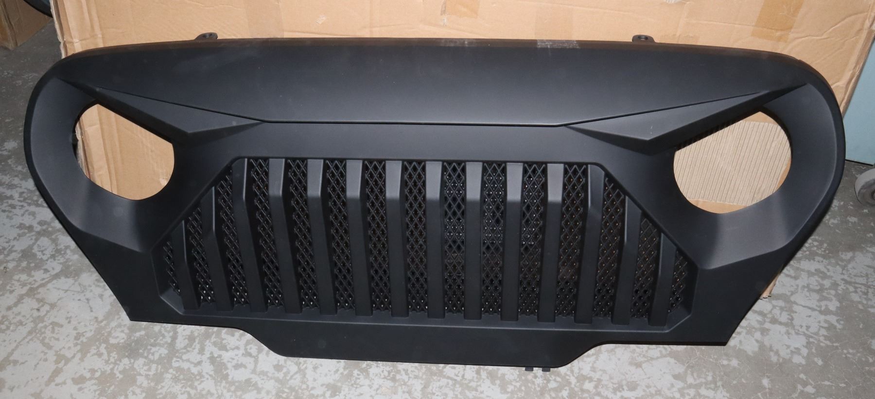 GRILL FOR 1997-2006 JEEP WRANGLER. ONE LOWER MOUNTING CLIP IS SNAPPED OFF. THE OTHER THREE MOUNTING POINTS ARE UNDAMAGED AND THERE APPEARS TO BE NO OTHER DAMAGE TO THE GRILL.