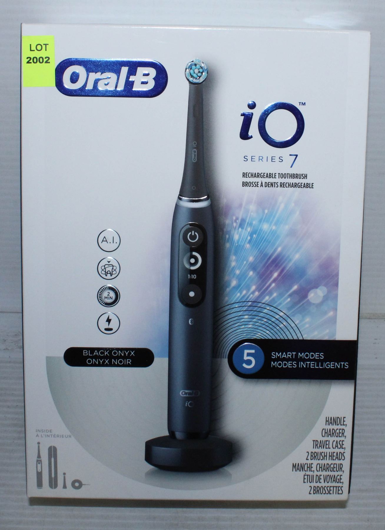 SMART MODES, ARTIFICIAL INTELLIGENCE RECOGNIZES YOUR BRUSHING STYLE TO GUIDE YOUR TO A CLEANER SMILE. MAGNETIC CHARGER, SMART PRESSURE SENSOR AND INTERACTIVE DISPLAY. COLOR: ONYX BLACK. COMES WITH HANDLE, CHARGER, TRAVEL CASE AND 2 BRUSH HEADS. RETAILS FOR $299.99.