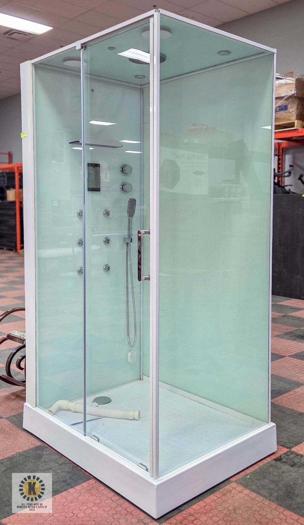 FEATURES INCLUDE FAN, BLUETOOTH, LIGHTS, RAINHEAD, HANDHELD WAND, FLEX HOSE DRAIN, 35" X 46" X 87". MSRP $5650.00 **ALL ITEMS MUST BE REMOVED BY 5PM SATURDAY, MAY 10TH 2025. ALL REMAINING ITEMS WILL BE SUBJECT TO A $6.00 PER DAY STORAGE CHARGE. ANY ITEMS REMAINING AFTER MONDAY, MAY 26TH 2025 WILL BE CONSIDERED FORFEITED. NO REFUNDS WILL BE ISSUED FOR FORFEITED ITEMS. TO SCHEDULE A PICK UP APPOINTMENT CLICK HERE