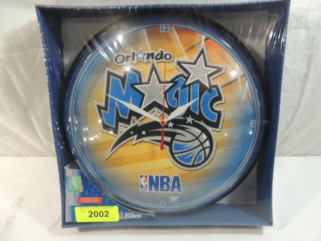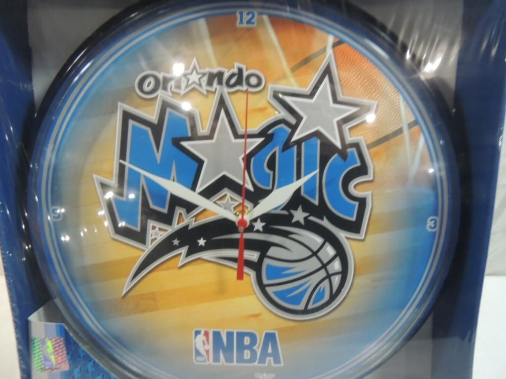 NBA BASKETBALL WALL CLOCK. COLLECTIBLE WIN CRAFT SPORTS WALL CLOCK. MADE IN THE USA NEW IN PACKAGE. NBA BASKETBALL MEMORABILIA. AS SHOWN SEE PHOTO FOR MORE DETAILS.