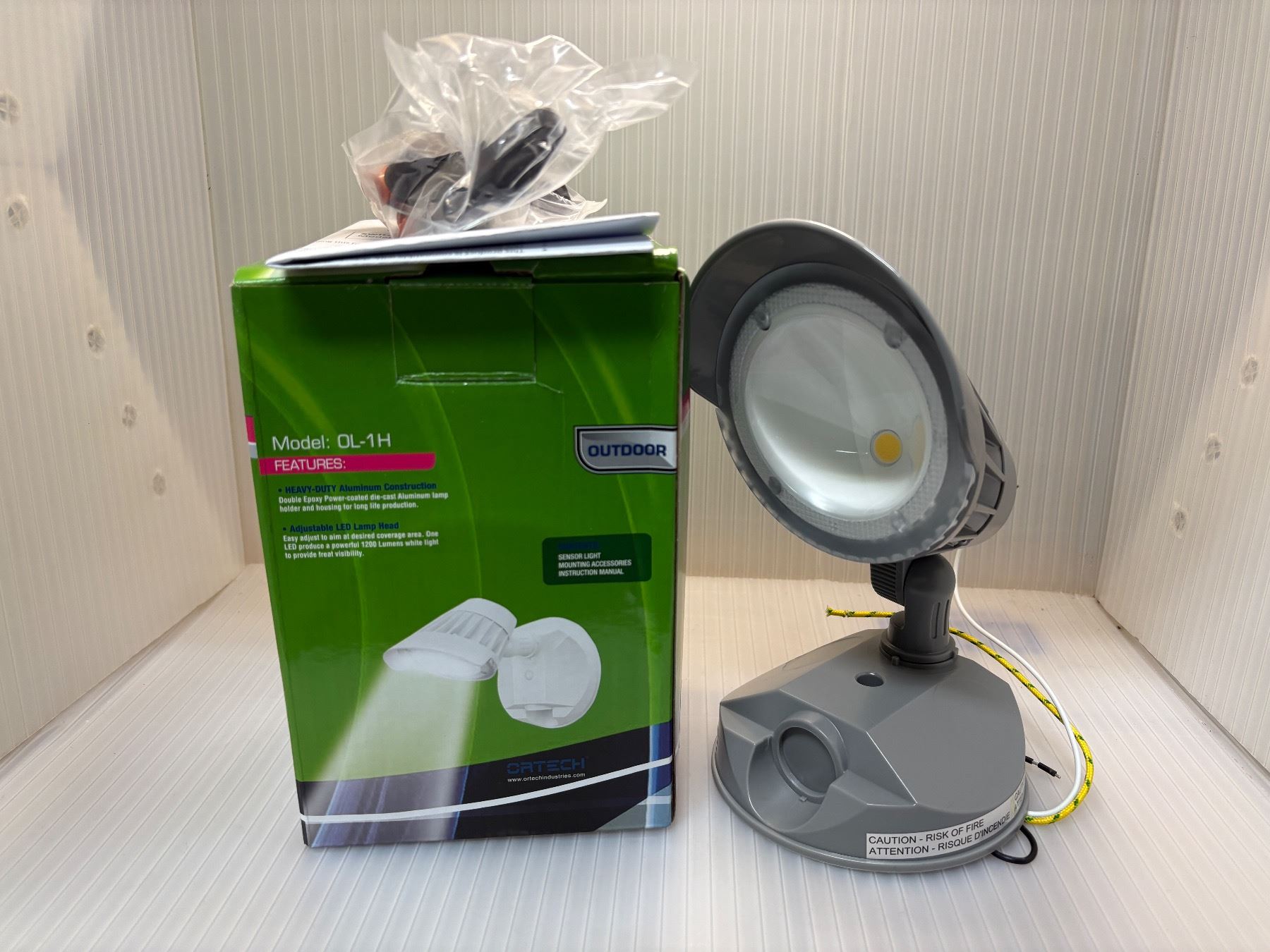 NEW ORTECH SINGLE HEAD LED OUTDOOR LIGHT WITH MOTION DETECTION 1200 LUMENS COLOUR GREY RETAIL PRICE PER PIECE $43.99 TOTAL LOT RETAIL VALUE $263.94