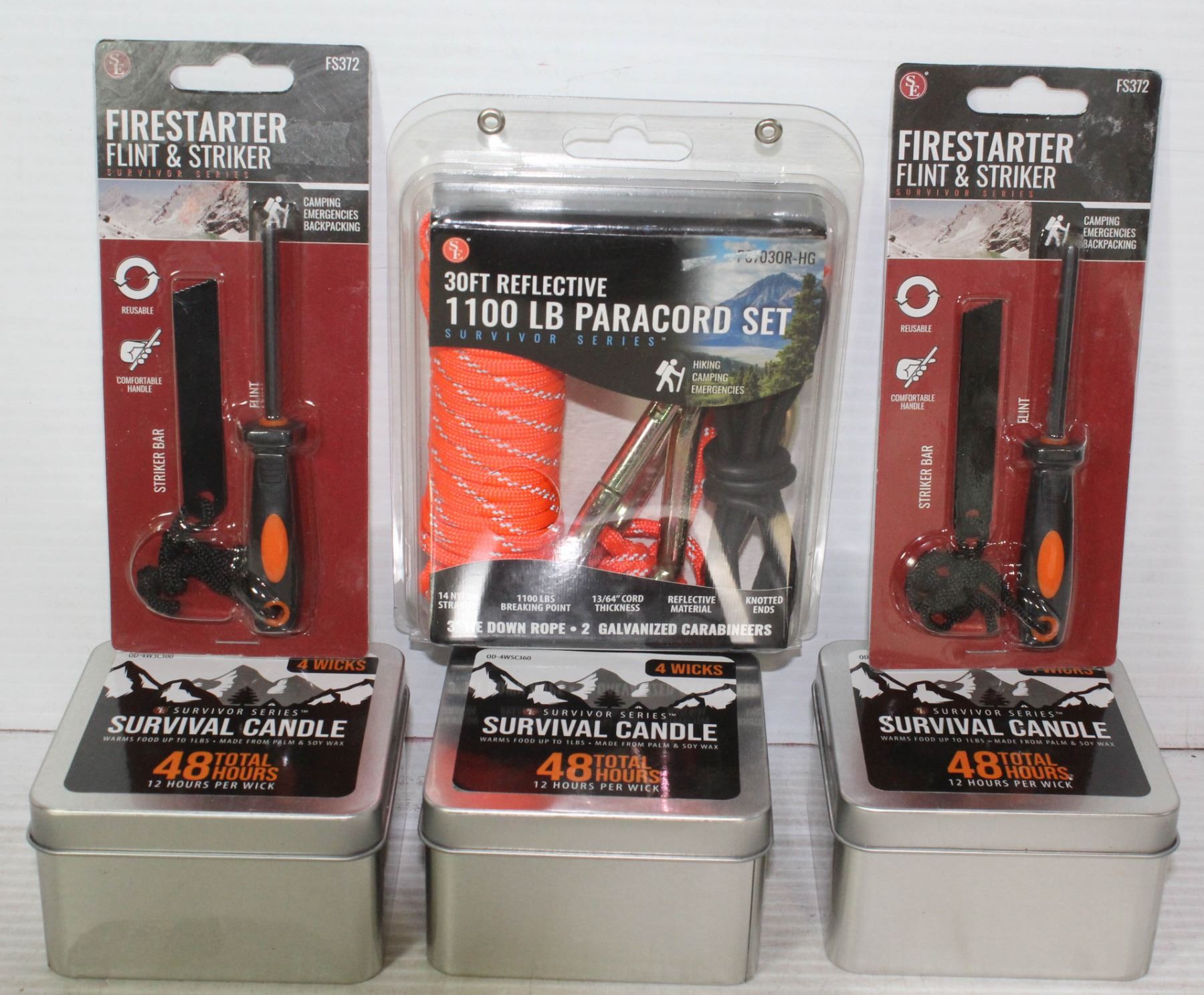 CANDLES 48 HOURS EACH 3 WICK, 2 FIRESTARTERS, PARACORD 30FT REFLECTIVE 1100 LB SET