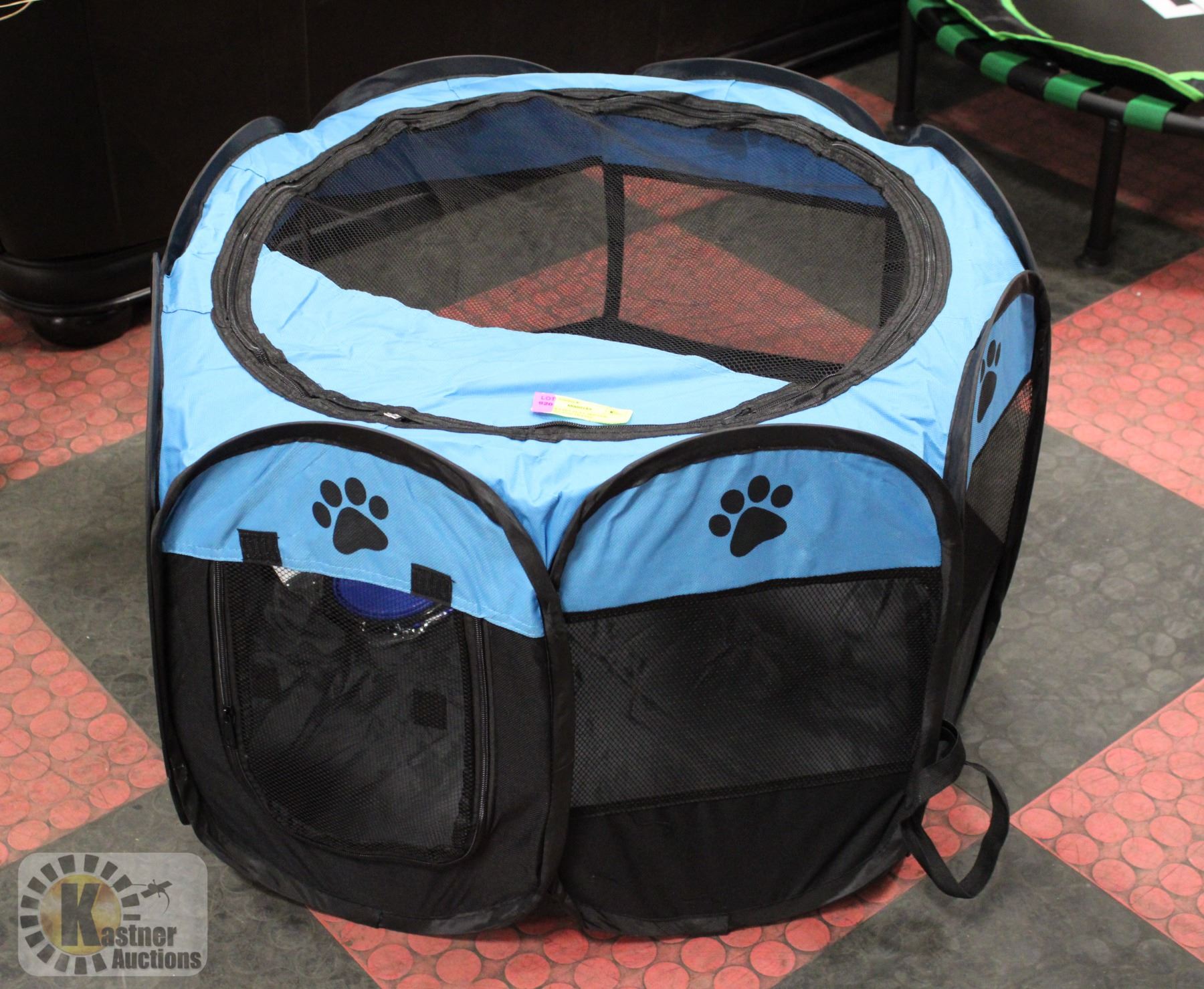 EASY FOLD UP AND STORAGE, ALL PARTS CONFIRMED, COMES WITH A TRAVEL FEEDING BOWL WITH CARABINER, APPROXIMATELY 26" WIDE, 18.5" HIGH, BLUE AND BLACK COLOUR