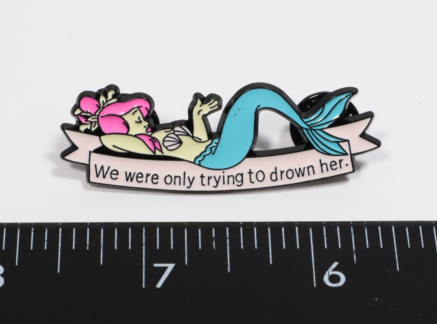 WE WERE ONLY TRYING TO DROWN HER. HAS TWO PIN ON THE BACK AND EXTRA BACKERS